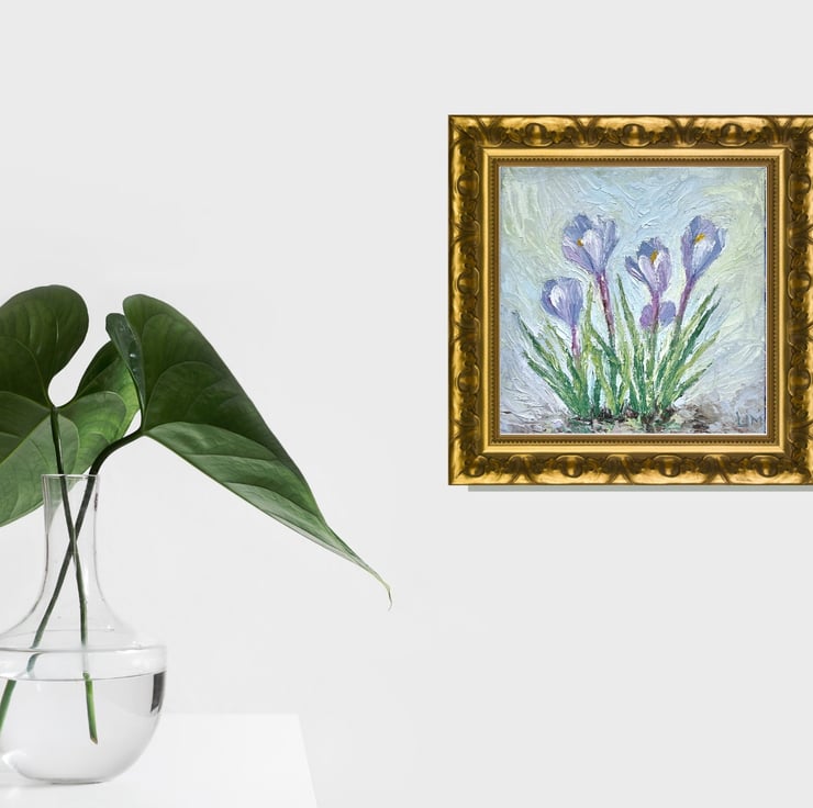 Original oil painting is 100% hand painted on canvas board, one of a kind art, in impasto technique with palette knife. Floral wall art is signed by artist (me) on the front and back side. This crocus wall art does not come framed.