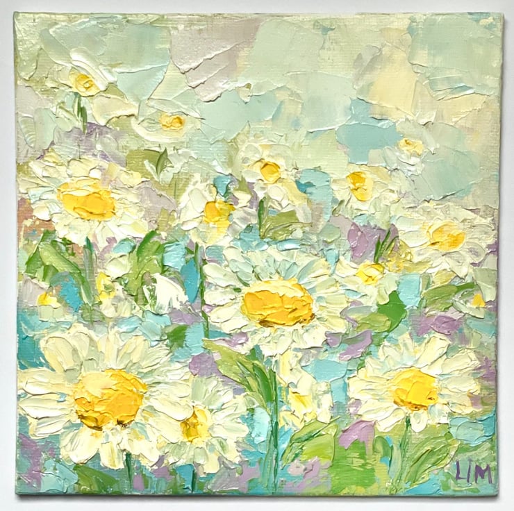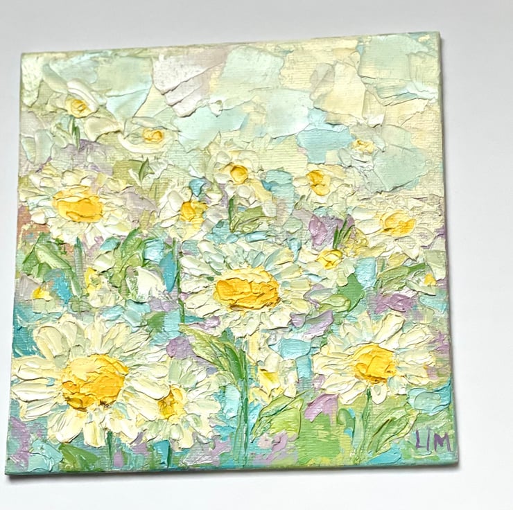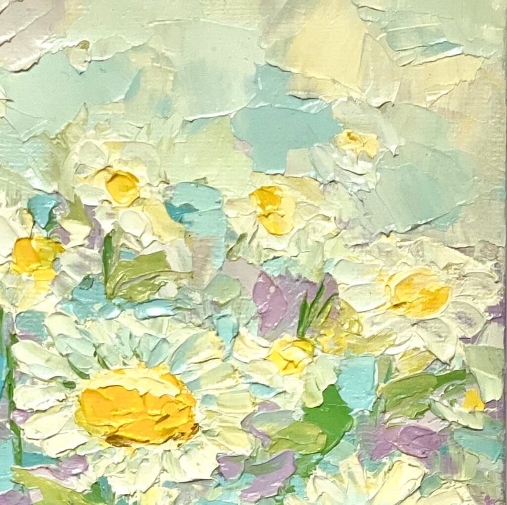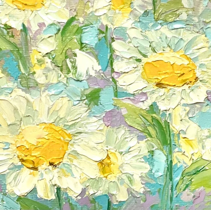 Original oil painting is 100% hand painted on canvas board, in impasto technique with palette knife. Daisy wall art is signed by artist (me) on the front and back side. This impasto painting does not come framed.