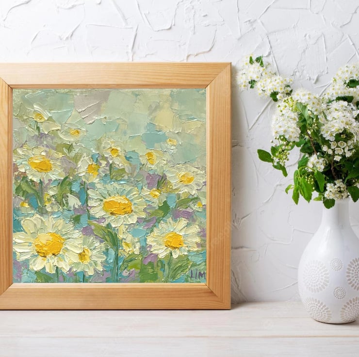 It s a perfect floral oil painting to brighten up your home, dining room or kitchen... or the best daisy birthday gift for your relatives and friends. Original paintings can be a great way to add colour, texture, and interest to a room, and can be used to complement or contrast with other decorative elements. The best way to use as a focal point in a room, or as a way to add interest to an otherwise neutral space. They can be hung alone or as part of a gallery wall, and can be used to create a specific mood or atmosphere in a room.