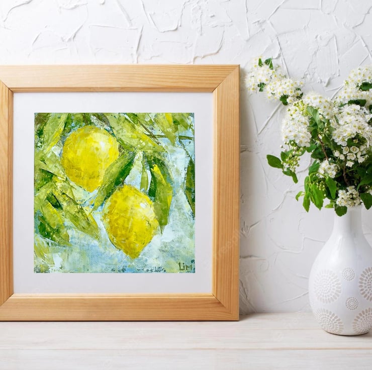 Original oil painting is 100% hand painted on canvas board, in modern oil technique with palette knife. Lemon art is signed by artist (me) on the front and back side. This still life painting does not come framed.