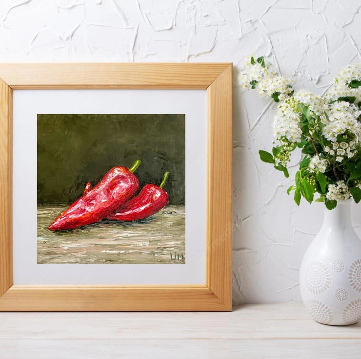 Original oil small painting is 100% hand painted on canvas board, one of a kind art, in impasto oil technique with palette knife. Pepper wall art is signed by artist (me) on the front and back side. This still life painting does not come framed.