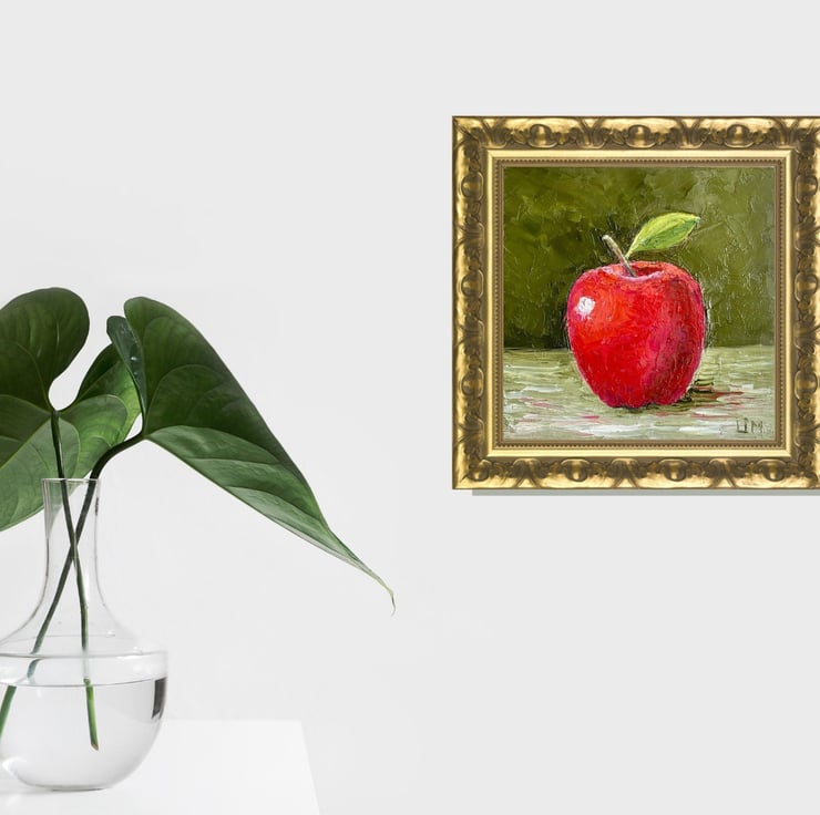 Original oil small painting is 100% hand painted on canvas board, one of a kind art, in impasto oil technique with palette knife. Apple wall art is signed by artist (me) on the front and back side. This still life painting does not come framed.