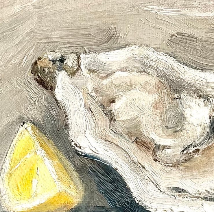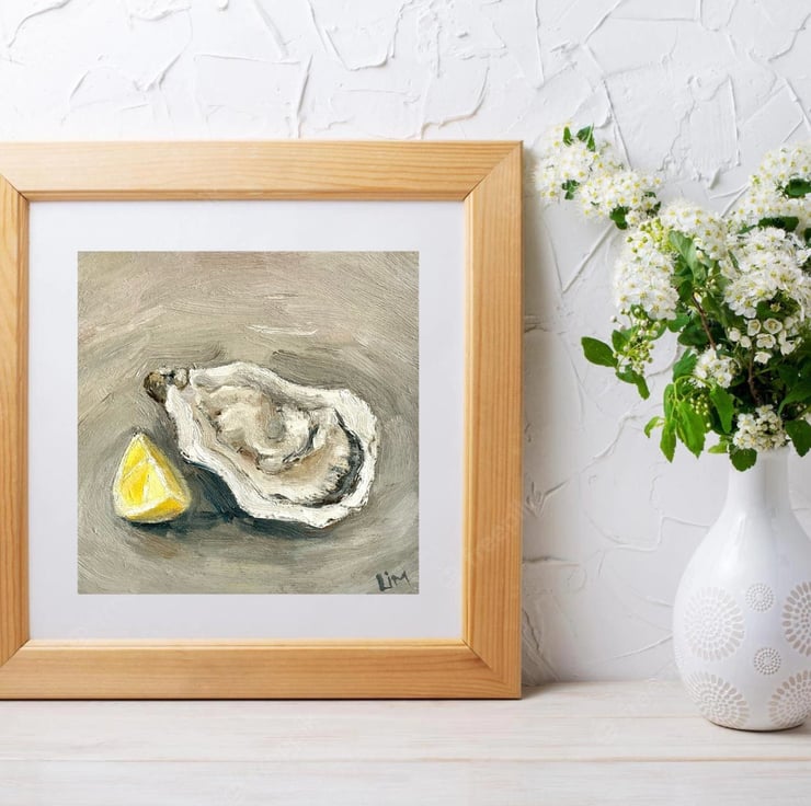 Original small oil painting is 100% hand painted on canvas board. Oyster wall art is signed by artist (me) on the front and back side. This food painting does not come framed.