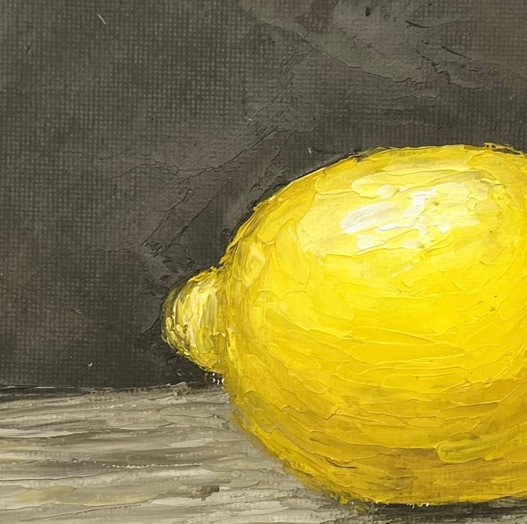 Original small oil painting is 100% hand painted on canvas board, in impasto oil technique with palette knife. Lemon wall art is signed by artist (me) on the front and back side. This still life painting does not come framed.