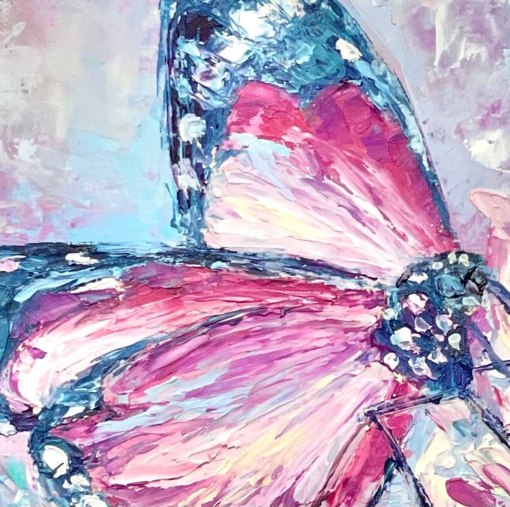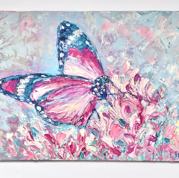 Original oil painting is 100% hand painted on canvas board in impasto technique with palette knife. Butterfly and flower painting is signed by artist (me) on the front and back side. This impasto painting does not come framed.