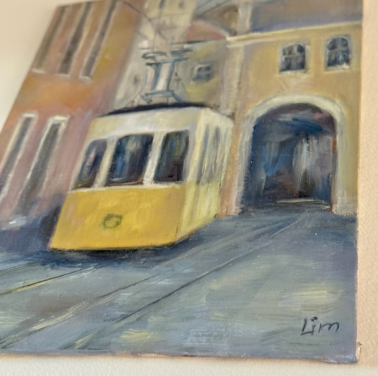 This painting was inspired by my visit to Lisbon, where the yellow trams weave through the steep. I was captivated by the contrast of warm colours, old buildings, and the gentle light reflecting off the rails. I wanted to capture that moment when the city feels both lively and peaceful — a scene full of character, movement and history. This artwork is my way of bringing a little piece of Lisbon’s atmosphere and beauty into your home.