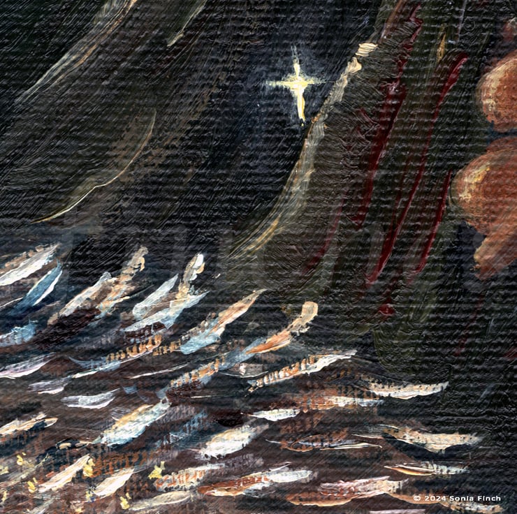 The painting was inspired by the rich autumn leaves and light on walks through the beautiful woodland close to my home in East Sussex, I decided to work on a small series of oil paintings exploring the elemental and natural world during the hibernation months.
