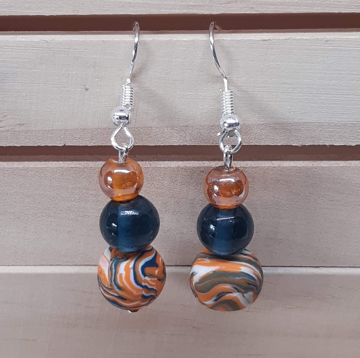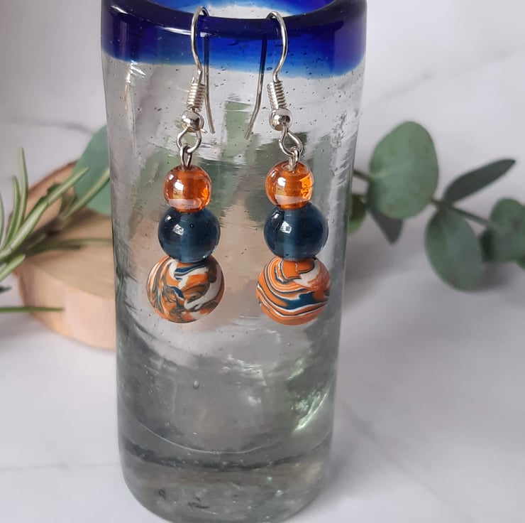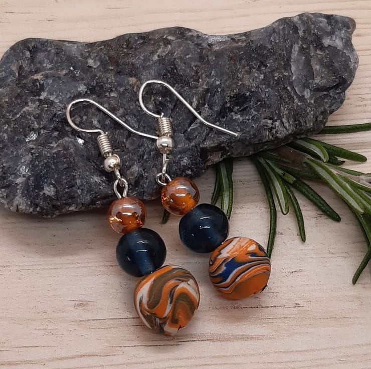Attractive polymer clay dangly earrings in a navy, orange and white unique swirl design