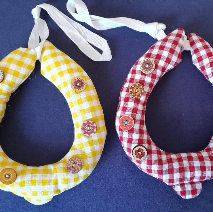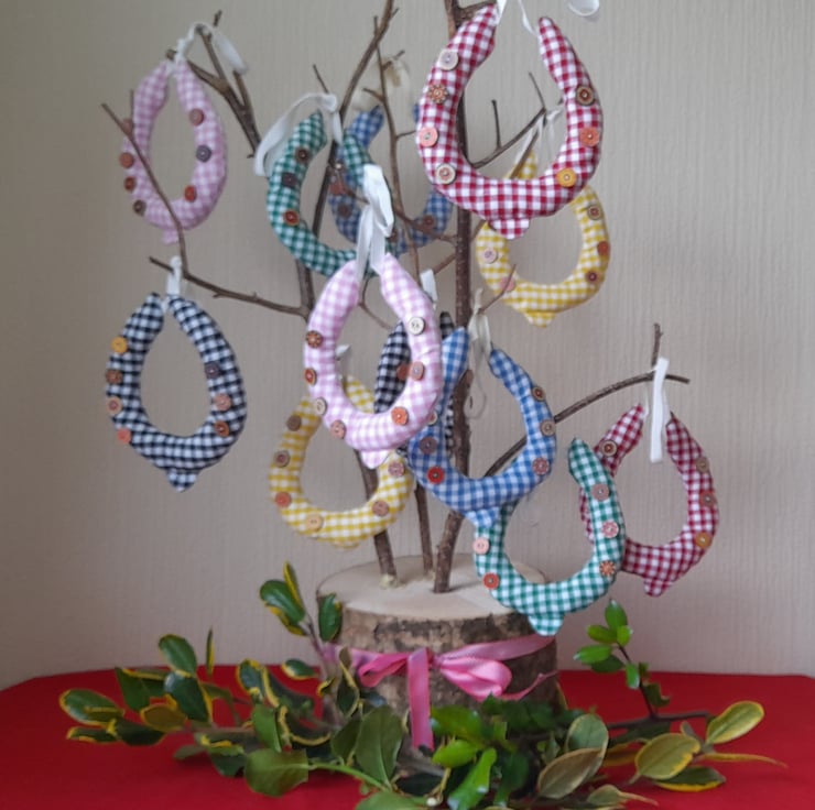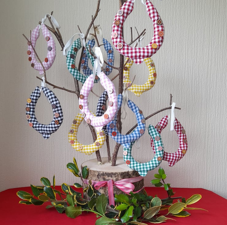 These home decoration, fabric, horseshoes have been made from rustic, country, Gingham fabric. They have matching gingham toe clips and colourful, patterned buttons that mimic the nail holes, adding detail and a country feel.