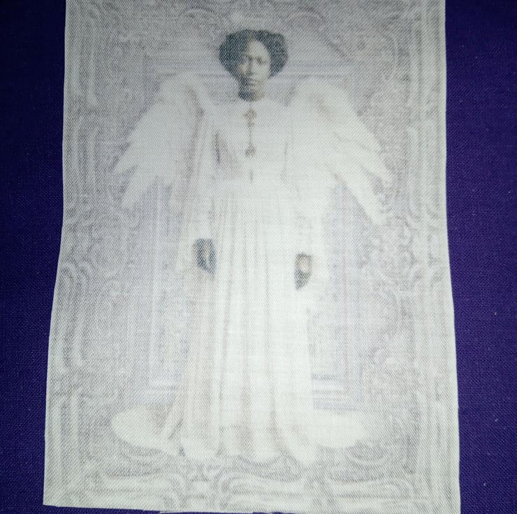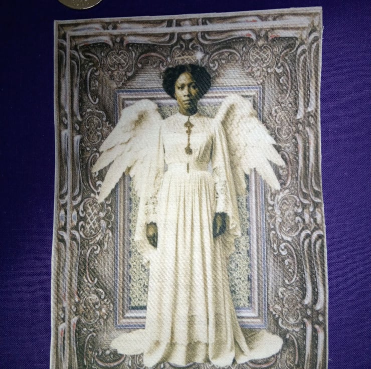 This is a charming fabric panel featuring a beautiful angel of colour. She stands in her white dress and sparkling halo against a silver frame backdrop. Perfect for Xmas of all year round.