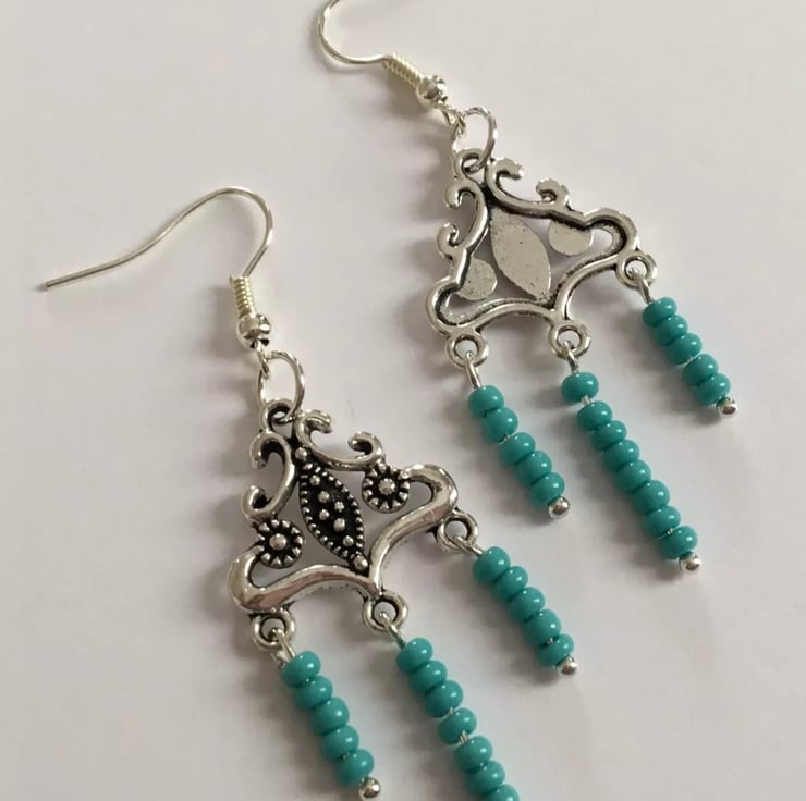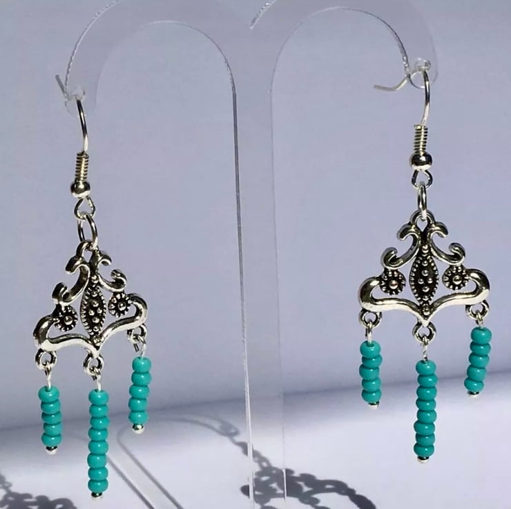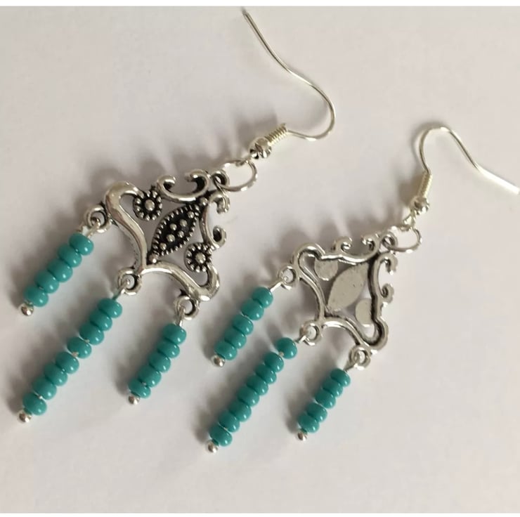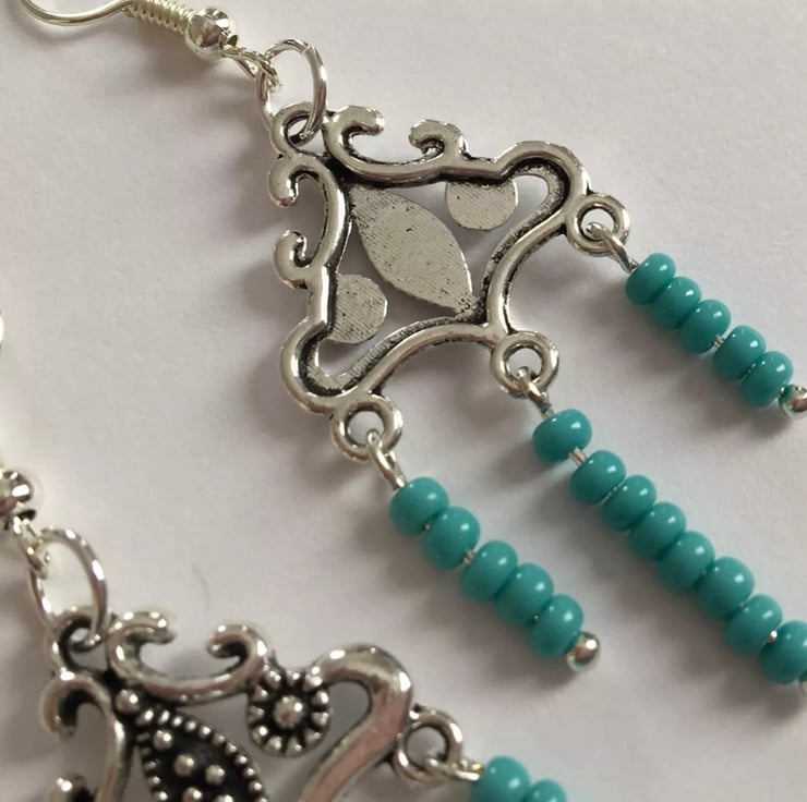 Created using Turquoise Coloured Seed Beads dangling from a beautiful Silver Tone alloy connector which is patterned on one side only (as shown in the photo's)