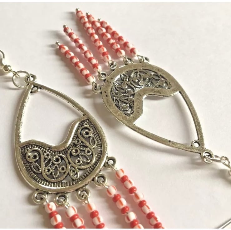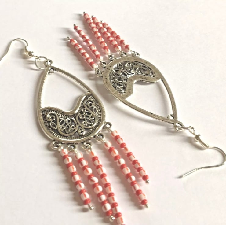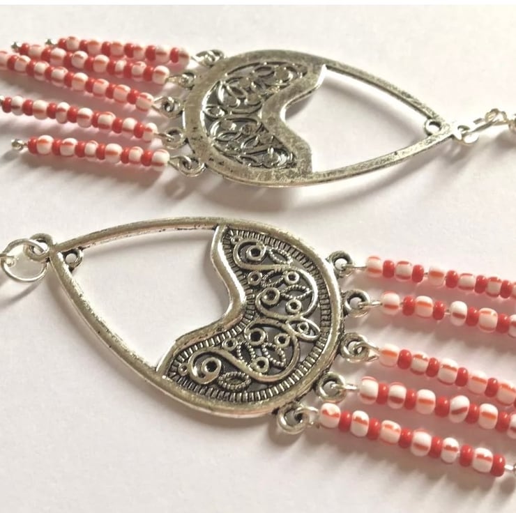 Created using Red & White Seed Beads dangling from a beautiful Silver Tone alloy connector which is patterned on one side only (as shown in the photo's)