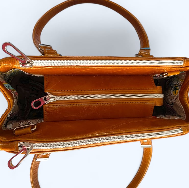 Made from high-quality, rescued leather, it features 3 zippered sections and a slip pocket for easy organisation. The colourful paisley-patterned lining and silver hardware give it a unique, yet classic look.
