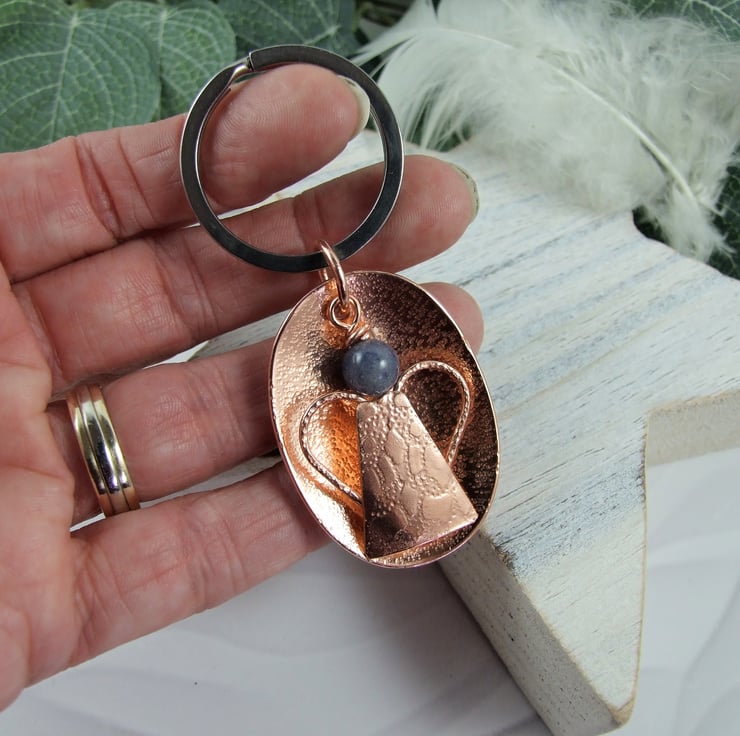 I have created the guardian angel entirely by hand. The base is made from pure copper sheet, cut and hammered for texture. The angel shape has been hand drawn onto copper sheet, cut out and textured with a lace pattern. The wings are formed from a heart shape made from copper wire soldered onto the back and an extra wire has been soldered to affix the blue aventurine which is securely wire wrapped in place. Fitted to a copper stainless steel spring ring, but this could easily be removed and replaced with ribbon or cord to turn it into a hanging decoration or Christmas tree decoration.