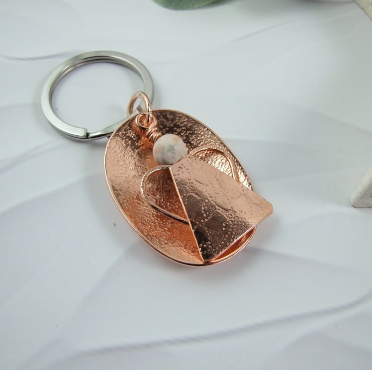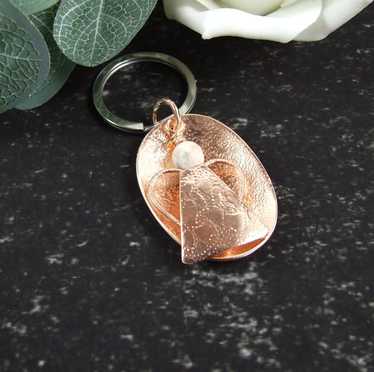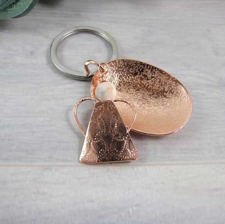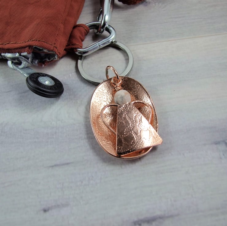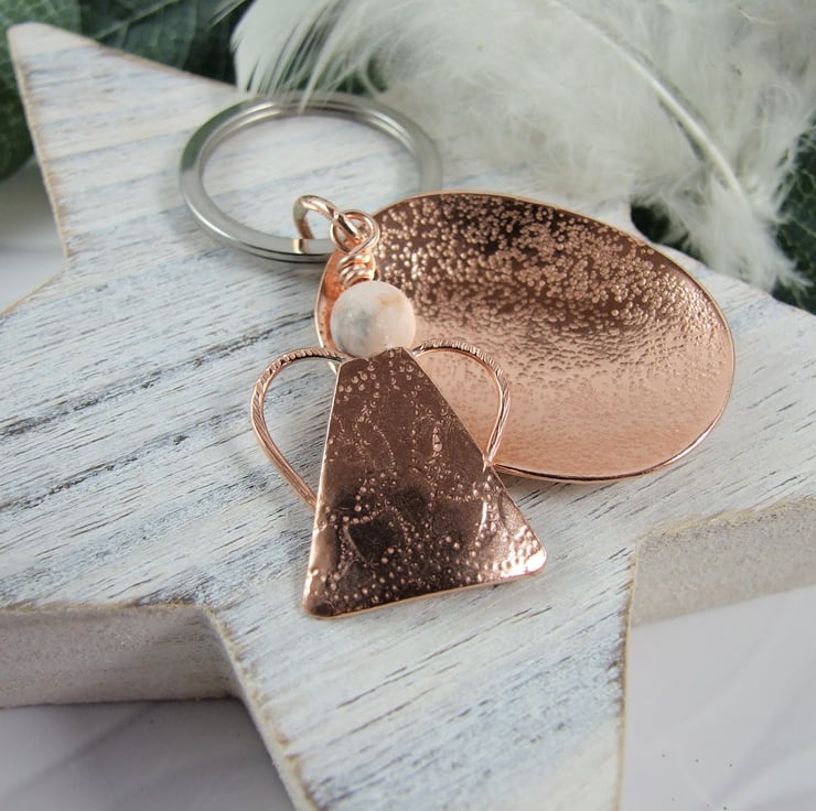 I have created the guardian angel entirely by hand. The base is made from pure copper sheet, cut and hammered for texture. The angel shape has been hand drawn onto copper sheet, cut out and textured with a lace pattern. The wings are formed from a heart shape made from copper wire soldered onto the back and an extra wire has been soldered to affix the jasper which is securely wire wrapped in place. Fitted to a copper stainless steel spring ring, but this could easily be removed and replaced with ribbon or cord to turn it into a hanging decoration or Christmas tree decoration.