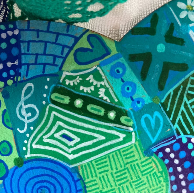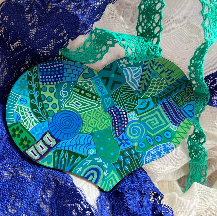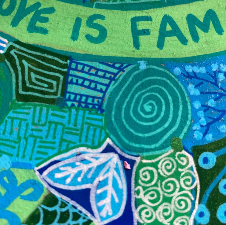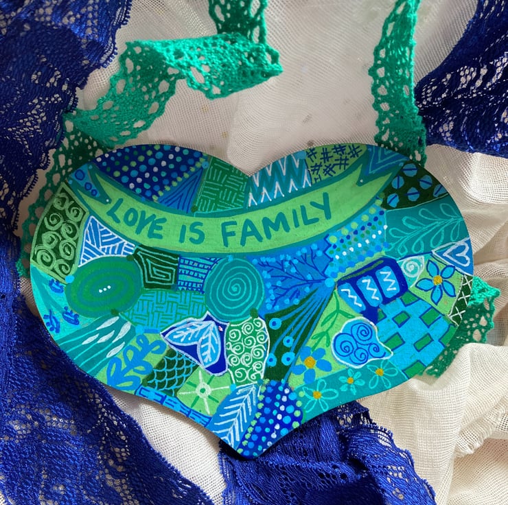 This love is family wooden heart has been hand painted in blues, greens, turquoise and white abstract doodles on both sides