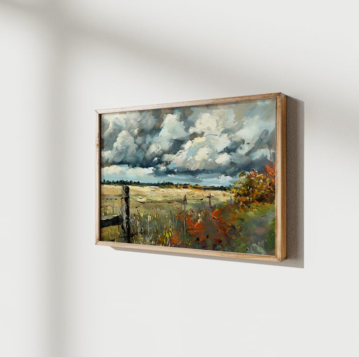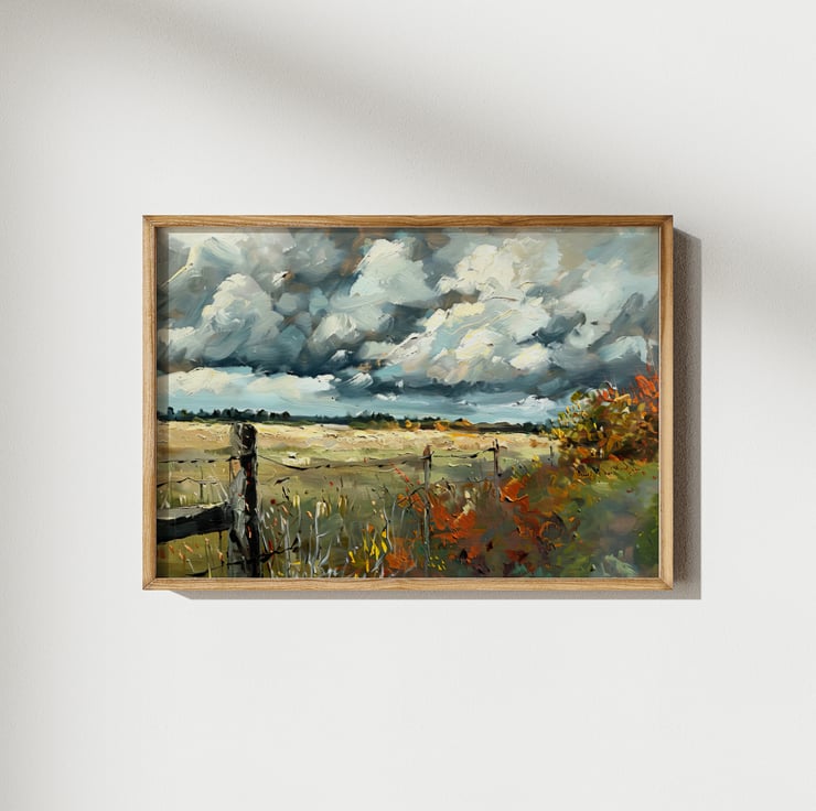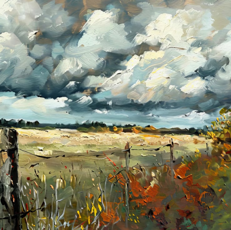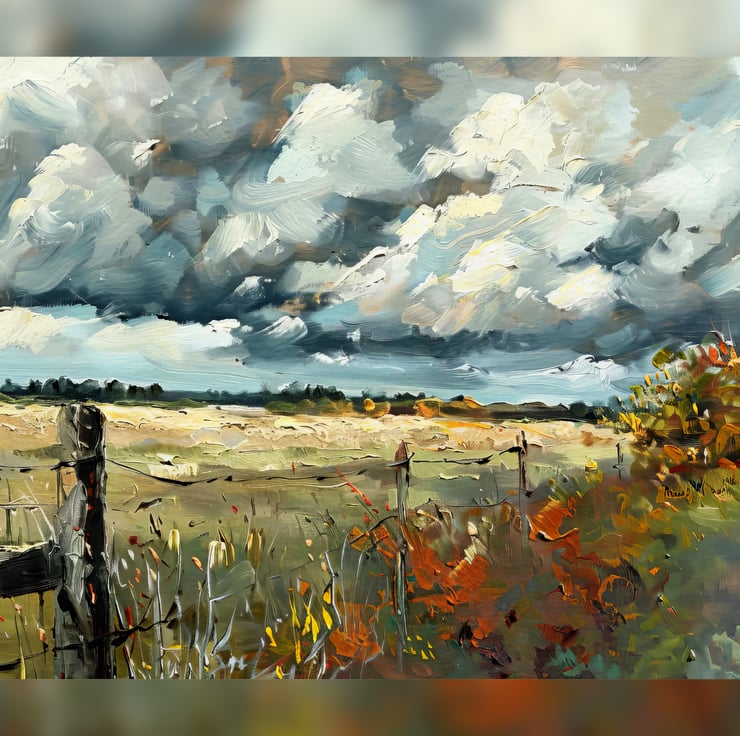 This expansive rural landscape painting captivates viewers with its striking depiction of nature’s beauty. The dramatic skies enhance the scene. The artist skillfully portrays wide open fields stretching toward the horizon. A sense of calm fills the air despite the powerful clouds above. Bold brushstrokes enrich the painting's texture, adding depth to the scene. The fence in the foreground adds rustic charm, emphasizing the rural setting.