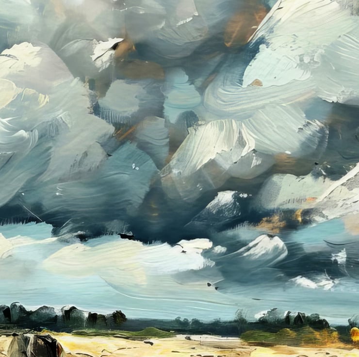 Additionally, the dramatic skies contrast dynamically with the soft, earthy tones of the fields. The movement in the clouds hints at an impending change in the weather. Yet, the peacefulness of the landscape remains intact.