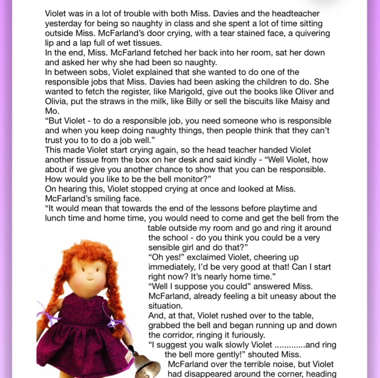 A full colour story book with 31 amusing stories about Violet and her antics. Violet is always up to some mischief or other and Miss. Davies and the other children from Mulberry Green Infants’ School are constantly amazed by all of the naughty things she does. Each story is just long enough for bedtime. Suitable for children 3-8 but enjoyed by anyone young at heart. Read about Violet, Maisy and Mo, Billy Spraggs and all of the other little characters in Miss. Davies’ class at Mulberry Green School.