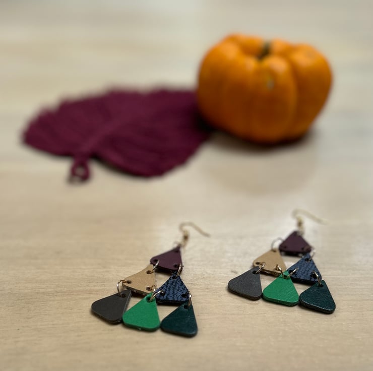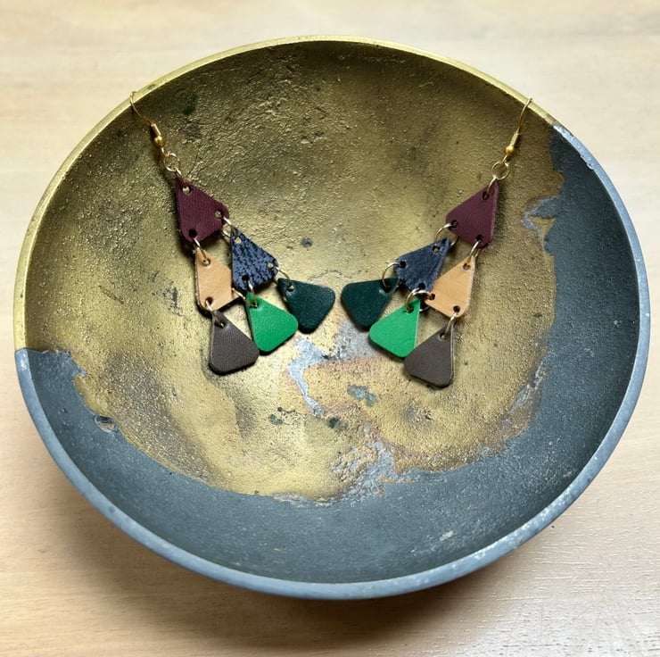 Leather chandelier earrings featuring double-sided multicoloured leather and gold metal ear wires.