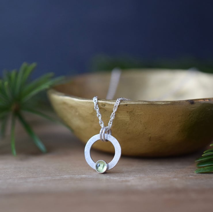 This gemstone and sterling silver circle pendant offers a timeless, minimalist design that beautifully combines the natural beauty of peridot with the elegance of handcrafted sterling silver.