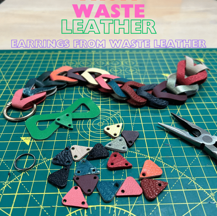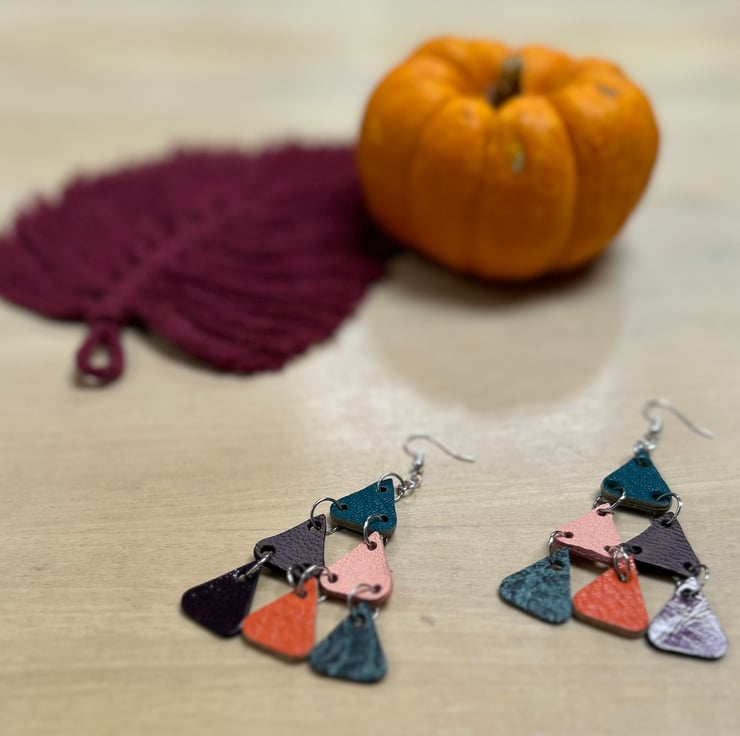 Leather chandelier earrings featuring double sided multi-coloured leather and silver metal ear wires.