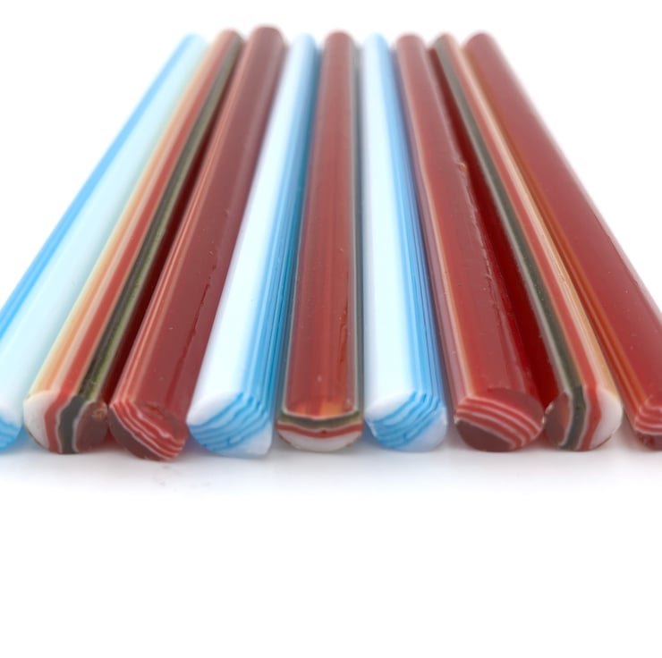 Nine approx 12cm lengths of cane to cut into murrine with Christmas bauble patterns. Cane diameters measure approx 6-8mm.