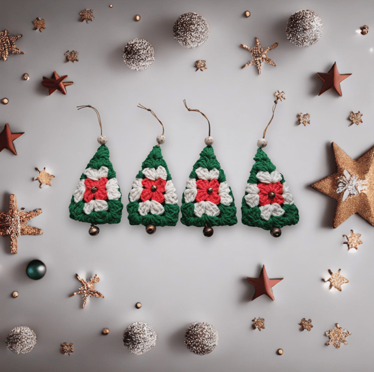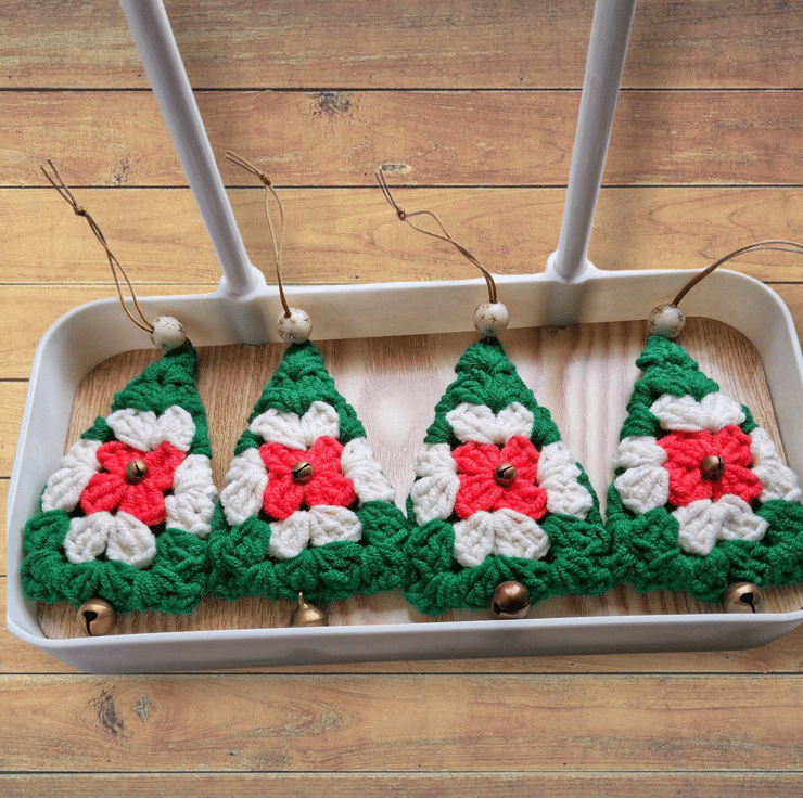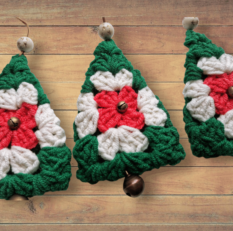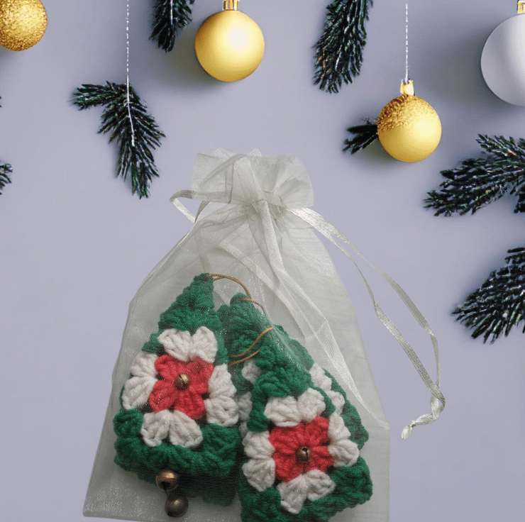 If you like a bit of a retro vibe for your Christmas tree this set of crocheted ornaments could be perfect for you. They have a little working bell for a trunk and a cute bead tree topper. They come in a little organza bag so they can be put away safely year after year. Height from top of tree to bottom of trunk 10 cm.