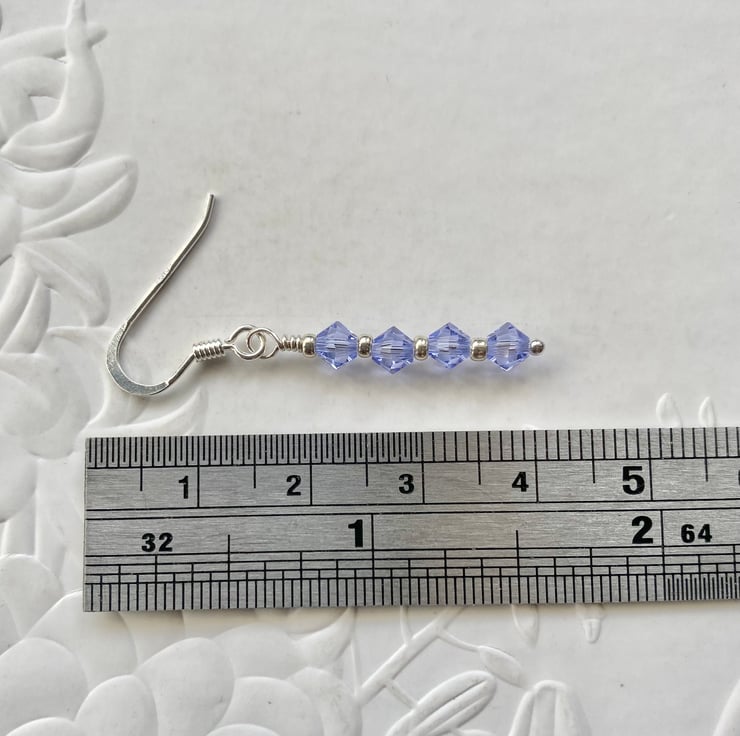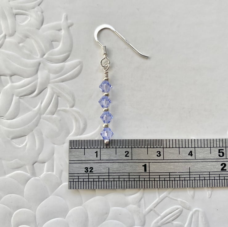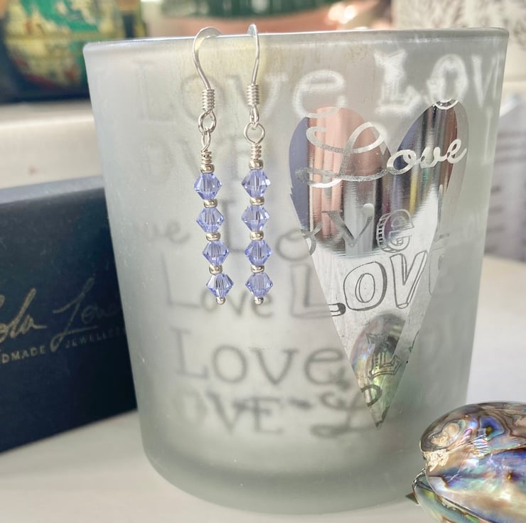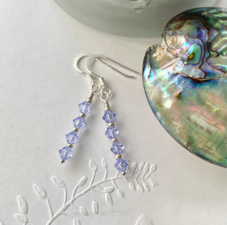 Lovely sparkly sterling silver Austrian Crystal earrings featuring high quality light violet Crystal bicones and sterling silver findings. I have finished the earrings with sterling silver shepherd hooks. Absolutely stunning earrings that sparkle, sparkle, sparkle. Just what you need for Party Season!