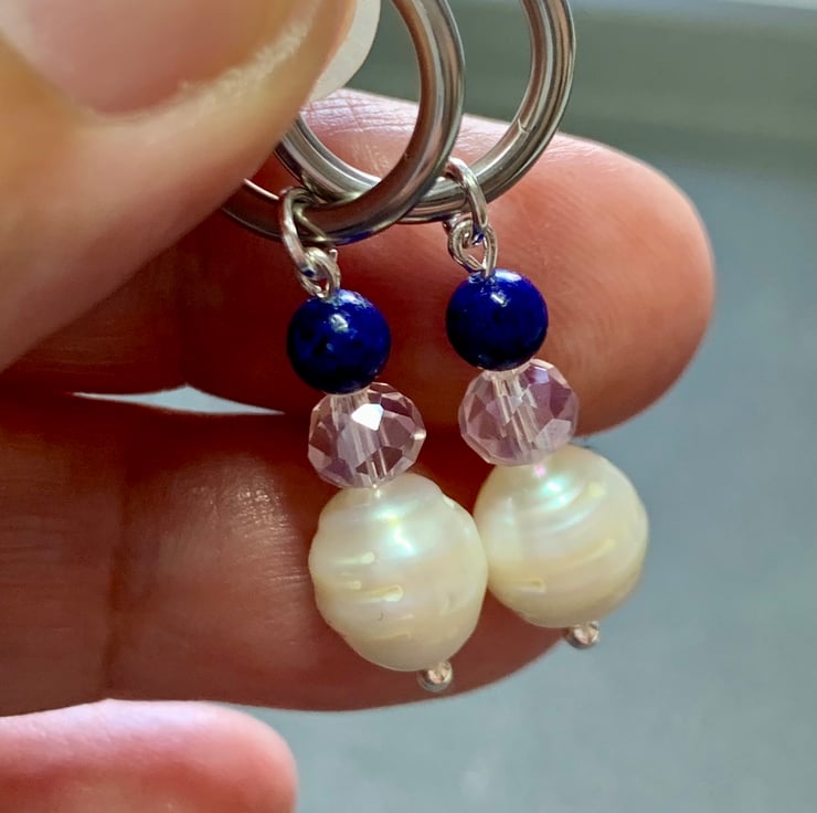 Beautiful dangle earrings made from a freshwater pearl, a delicate pink cut glass crystal and blue Agate bead.