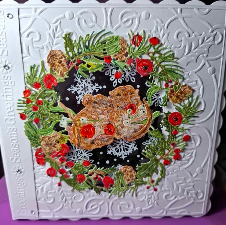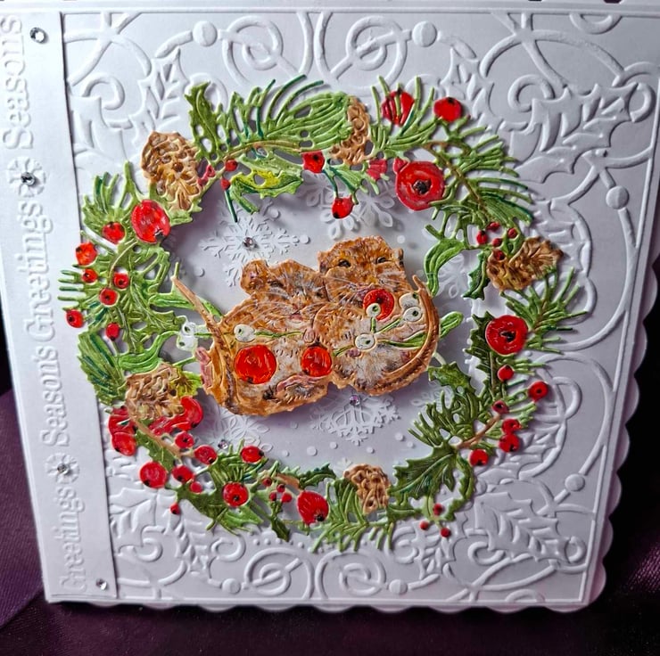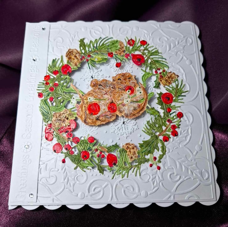 This Exquisite Hand Crafted And Painted Peek-A-Through Stand Alone Card And Gift Tag For The Festive Season With Its Unique Design Is Loving Created For That Special Someone. This Beautiful Peek-A-Through Card Has Two Cheeky Little Dormice Wanting To Wish Everyone A Merry Christmas, The Decoupage Scene Is All Hand Painted So Realistically You Could Almost See These Little Furry Bundles Whiskers Twitching The Acetate Backing Of The Through Window Even Has Snow Flakes Falling Giving The Scene Even More Of A 3D Realism Effect And Perspective, It Is Also Accompanied With A Hand Crafted And Painted/ Written Gift Tag. Each Card Is Crafted With Intricate Detail For A Delight To Treasure And Will Be Shown With A Hand Crafted Decorated Box Or Cardelope Where Applicable Also Prices Reflects The Hours Of Crafting This Unique Card And Quality Of Materials Used.