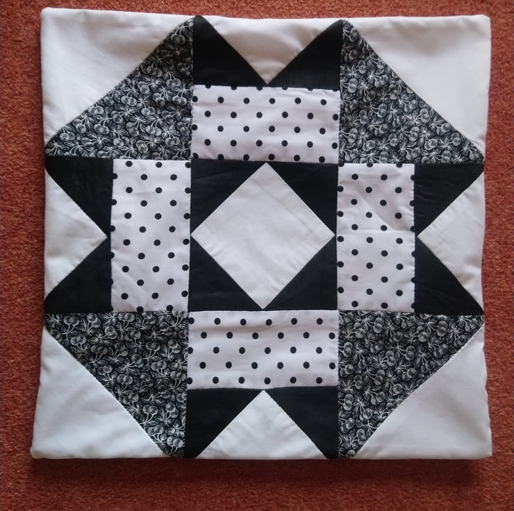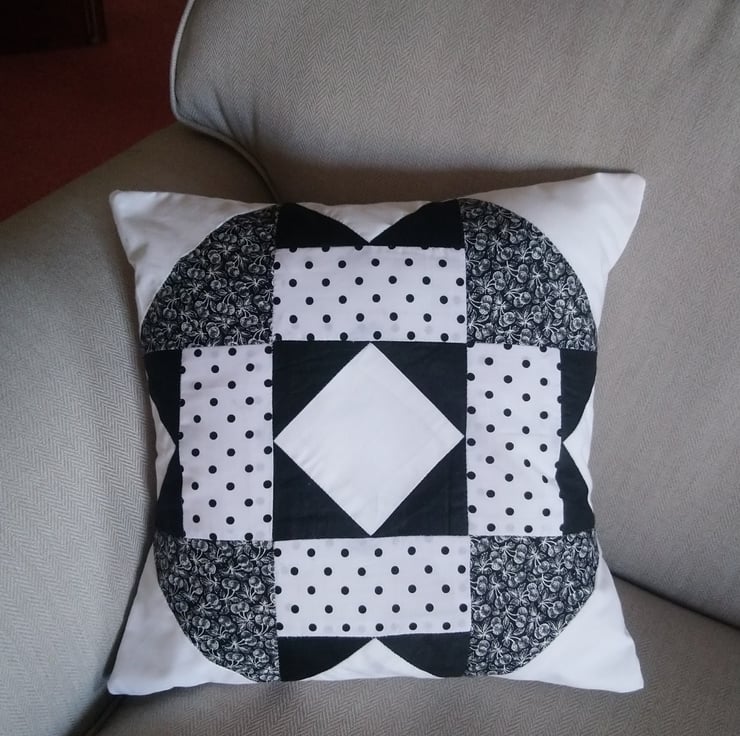 Handsewn patchwork cushion cover in black and white. Four different cotton fabrics make up the design, plain black, plain white, black and white spots, and a black and white floral.