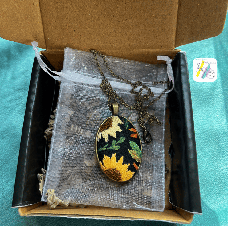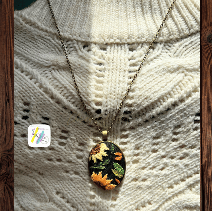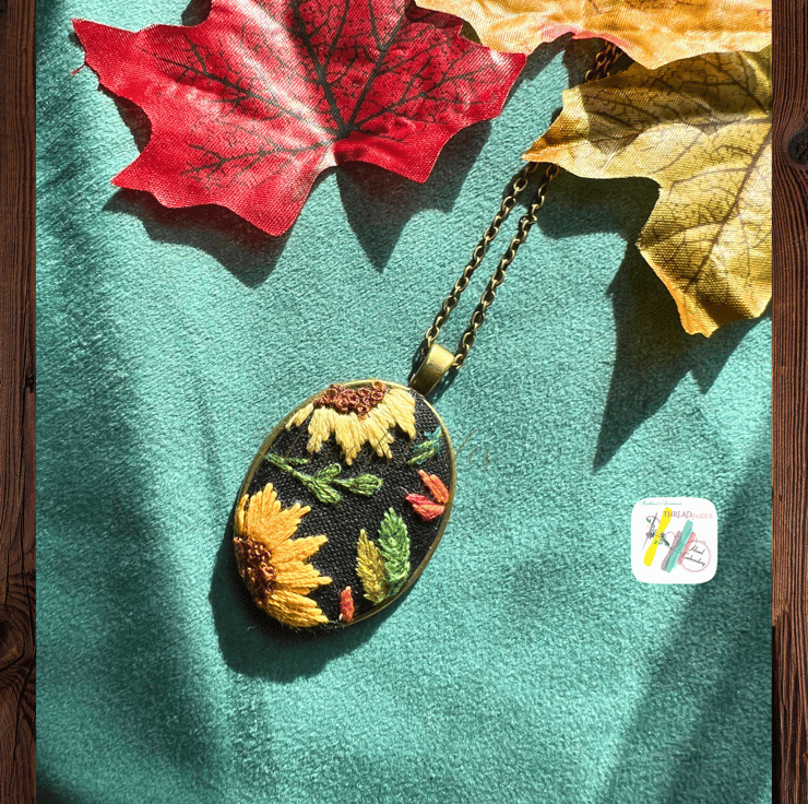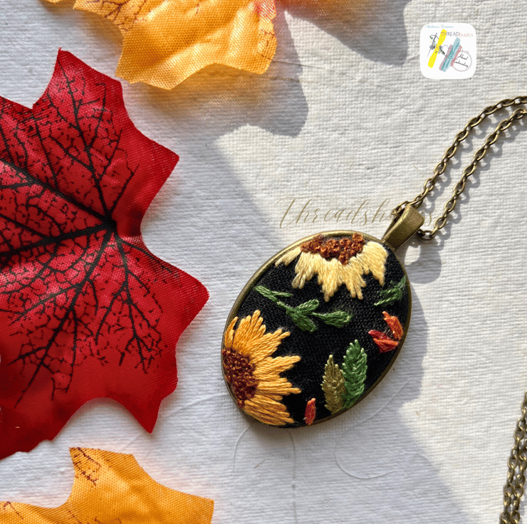 Details :- hand embroidered oval shaped pendant. Beautiful Sunflower and autumn leaves design in plain edge antique bronze look pendant is fall season appropriate and ideal for gifting. Embroidered on black colour linen fabric and with DMC embroidery threads. Very beautiful design with vintage look! Handmade with love and passion.