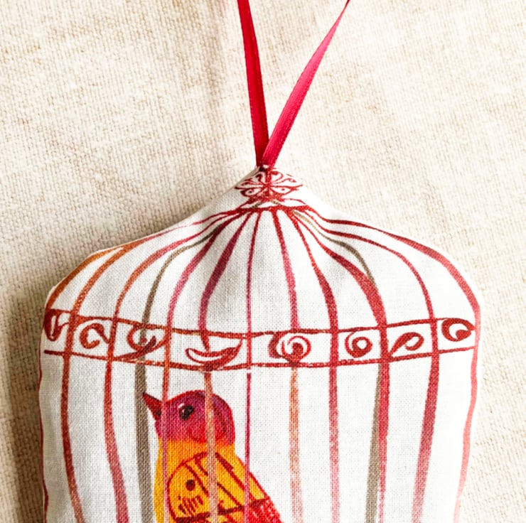 The design has been printed onto 156gsm cotton fabric with plain white on the reverse and finished off with ribbon loop.