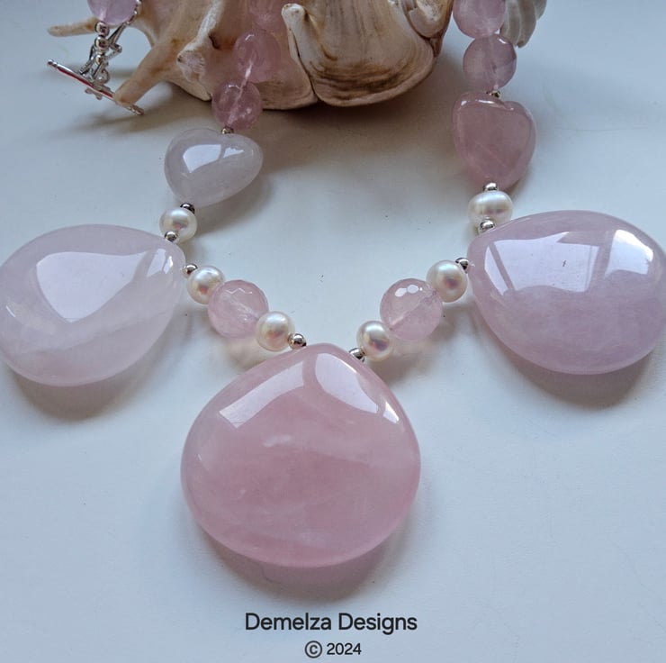 In the are three AAA graded 3.5cms large rose quartz drops with 10mm faceted AAA graded rose quartz rounds and 5-6mm cream freshwater culture pearls. To either side are large 3cm puffy smooth heart cut rose quartz stones, following on with further 10mm faceted rose quartz gemstones. Within the design are 3mm sterling silver beads adding a touch of opulence and sparkle during wear. The rose quartz is natural and untreated.