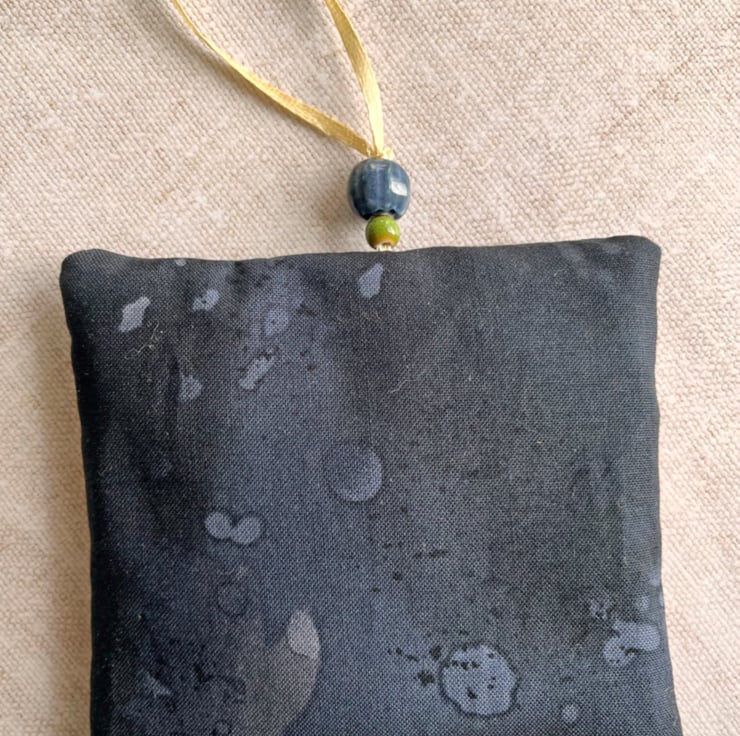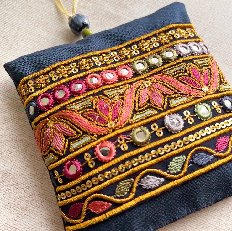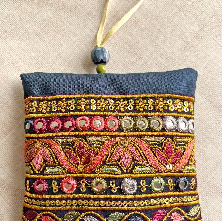 The lavender bag has been filled with dried lavender from Provence. It's decorated with a section of embroidered Indian trim which I've hand stitched onto cotton fabric. I've used batik fabric for the reverse and added a couple of ceramic beads to the hanging loop.