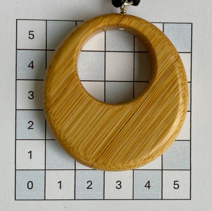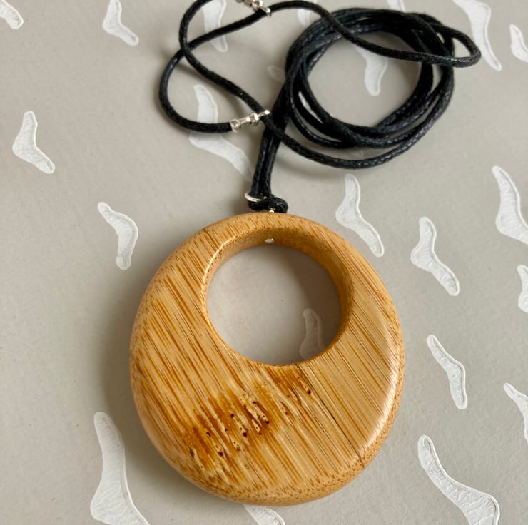 A handmade bamboo pendant with a hard wax satin polish. It was once a wooden chopping board. The pendant is oval with an off centre hole. The outer edges are rounded giving it a smooth feel. One side of the pendant has a lovely pattern where the bamboo joint forms. You can also see the lines of the laminate strips showing its chopping board origins.