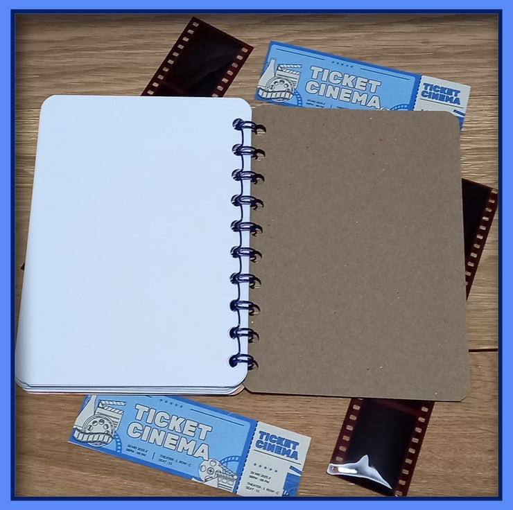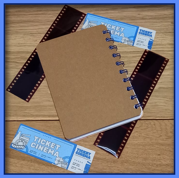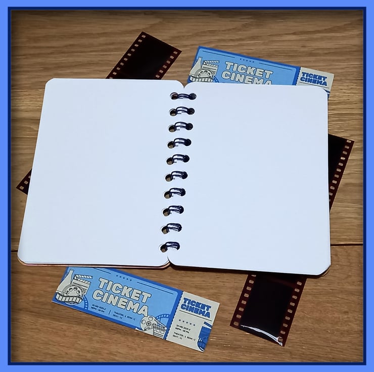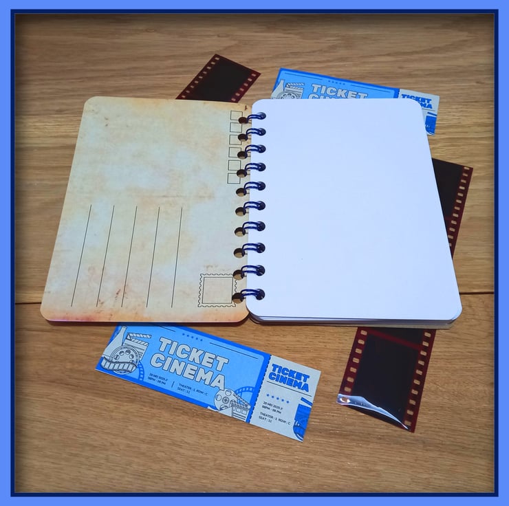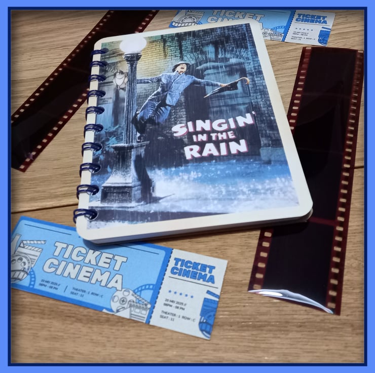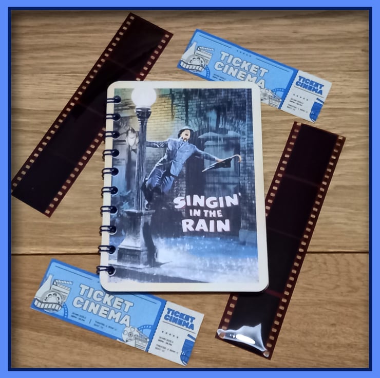 This wire bound Notebook has a front cover made from reproduction Postcard featuring a old mover poster of Singing in the Rain, starring Gene Kelly, Debbie Reynolds and Donald O'Connor, one of my all time favourites. There are 20 pages (40 sides) white cartridge paper, which have been sprial bound with blue wire, the back cover is brown card. The over all size is 10cm wide by 14cm high, ideal size to pop in a coat pocket or bag, ready for you jot down notes or sketch. Great gift for a movie lover or movie buff, good size to pop into a Christmas Stocking