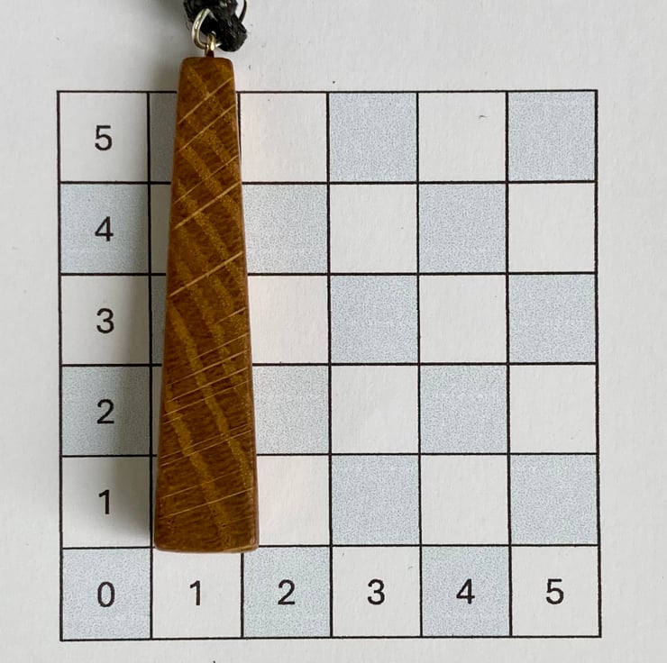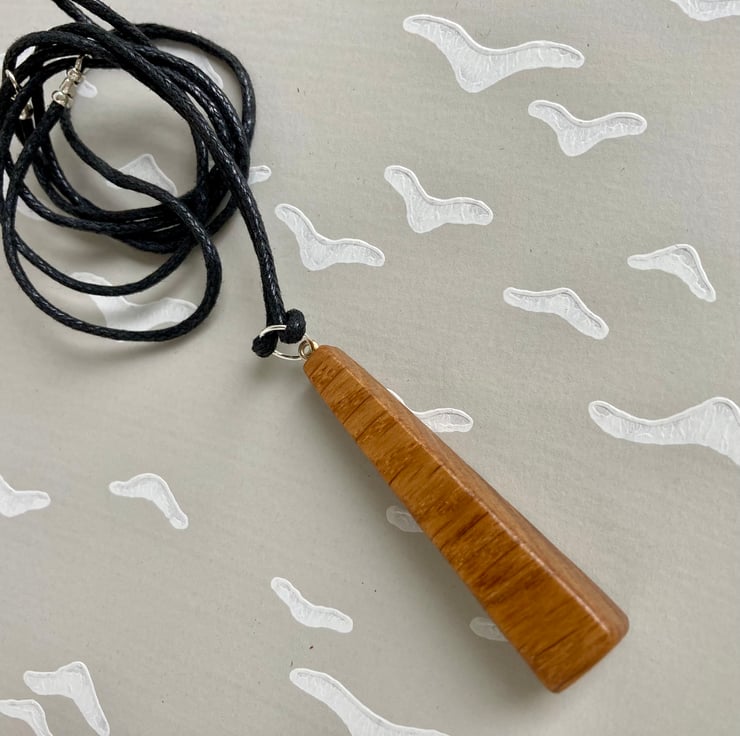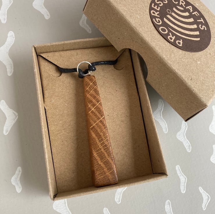 A handmade oak pendant necklace with a hard wax satin polish. This narrow pendant shows off the different grains of wood on each side which you can see in the different pictures. It’s quite distinct in this oak. It has a square base which tapers towards the top.