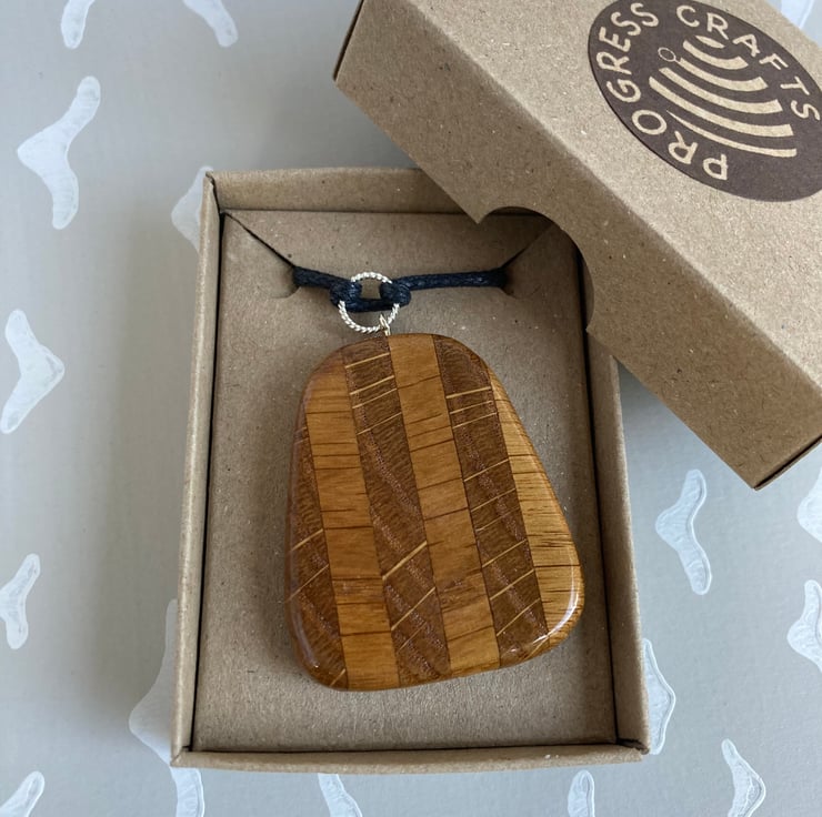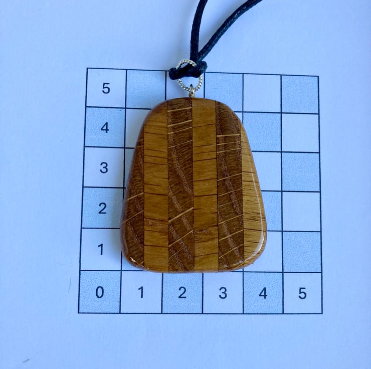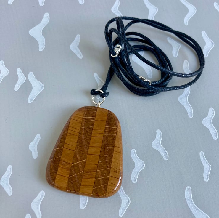 A handmade trapezoid shaped wooden pendant necklace using oak strips and finished with a glossy finishing oil polish. The oak is all from the same piece of wood but strips are showing alternate grain patterns which gives it the different shades. It has a twisted sterling silver jump ring which catches the light and a black waxed cotton necklace.