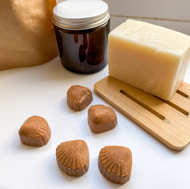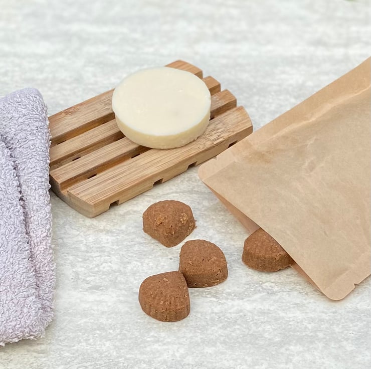 This listing is for one pouch of six small shell shaped bars, packaged in biodegradable Kraft pouches and the pouch can be added to your food waste bin when you’ve finished the packet. They are industrially compostable to the European standard EN 13432.