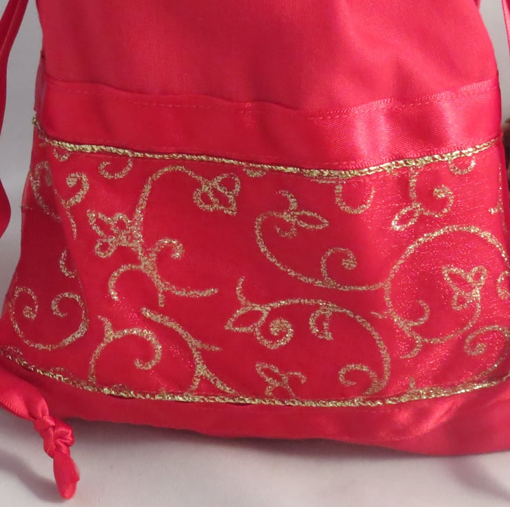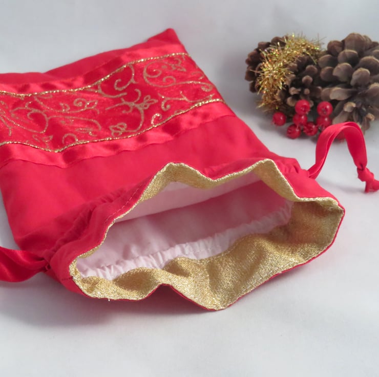 This bag is a beautifully festive way to present a gift. The front of the bag has been decorated with a length of sparkly gold ribbon, edged above and below with lengths of red satin ribbon. The main lining is a white fabric. The gathered frill is lined with a metallic gold fabric - this shows when the bag is gathered closed.