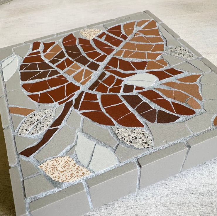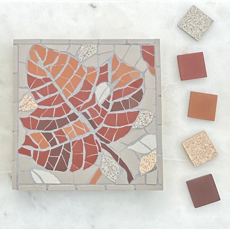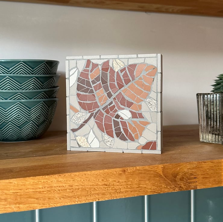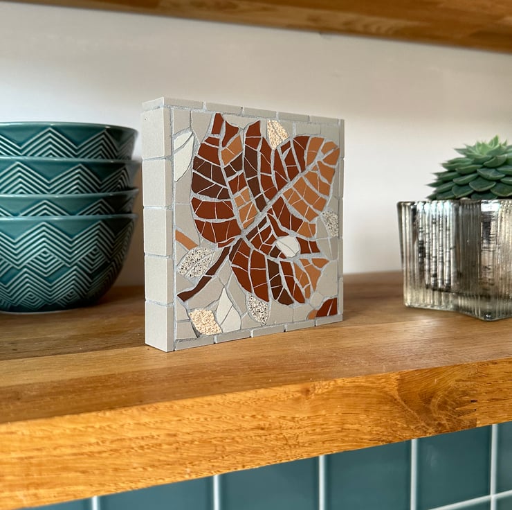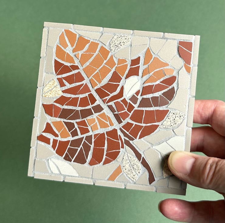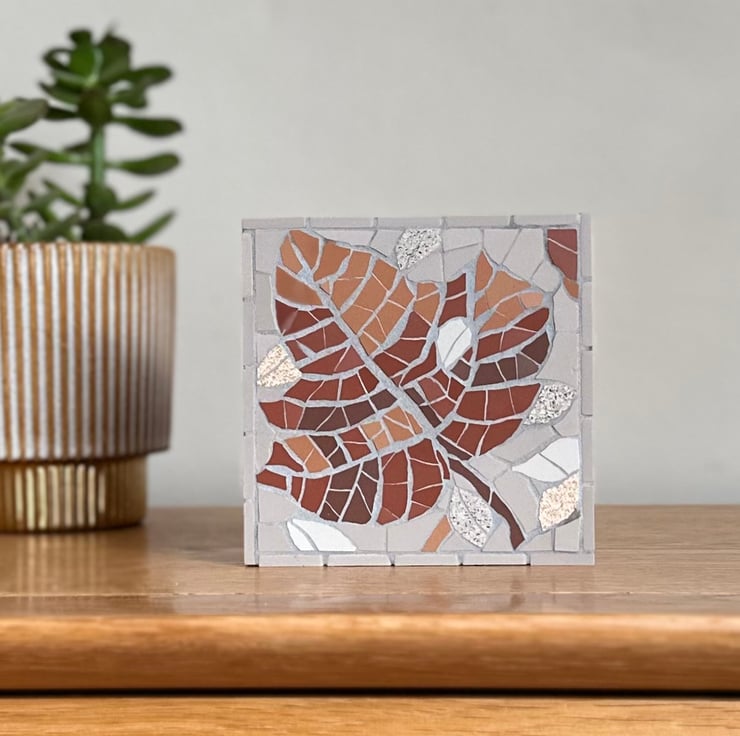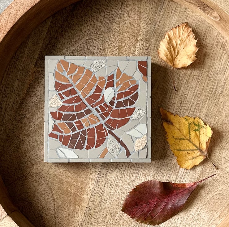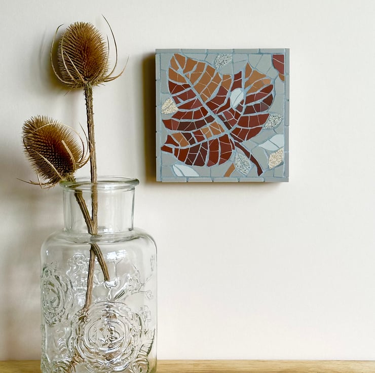 This mini, original botanical art is created in mosaic and features a red autumn leaf on a grey background. The colour palette is in shades of brick red to burnt orange. The body of the leaf is formed by tiny hand cut tile and the grey grout creates the veins.