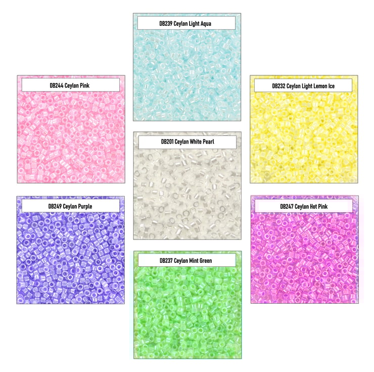 DB-244 Ceylon Pink, DB-239 Ceylon Light Aqua, DB-232 Ceylon Light Lemon Ice, DB-247 Ceylon Hot Pink, DB-237 Ceylon Mint Green, DB-201 Ceylon White Pearl, DB-249 Ceylon Purple