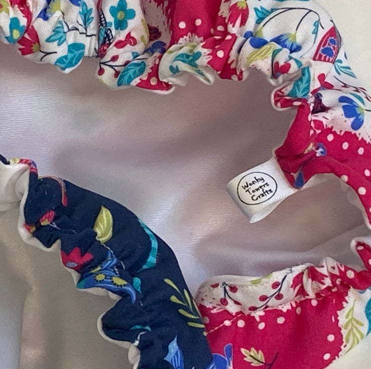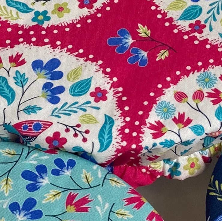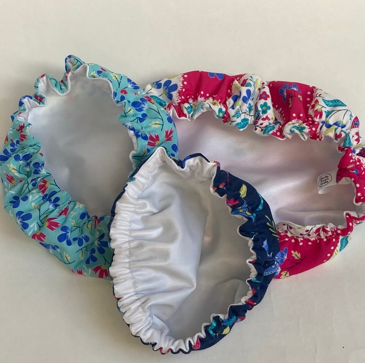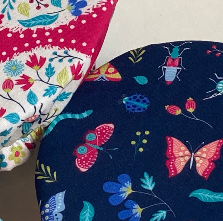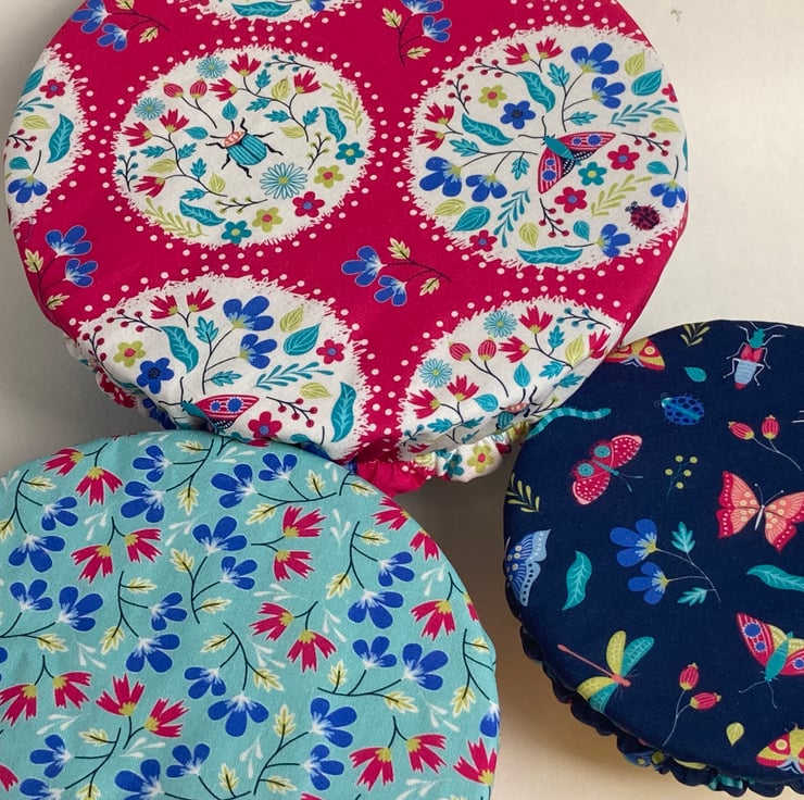 This set of 3 covers will fit bowls approximately 23cm, 19cm and 16cm (9", 7.5" and 6"). They are made from 3 gorgeous cotton fabrics in pinks and blues with an abundance of butterflies, beetles and flowers. They are lined with pale blue PUL.
