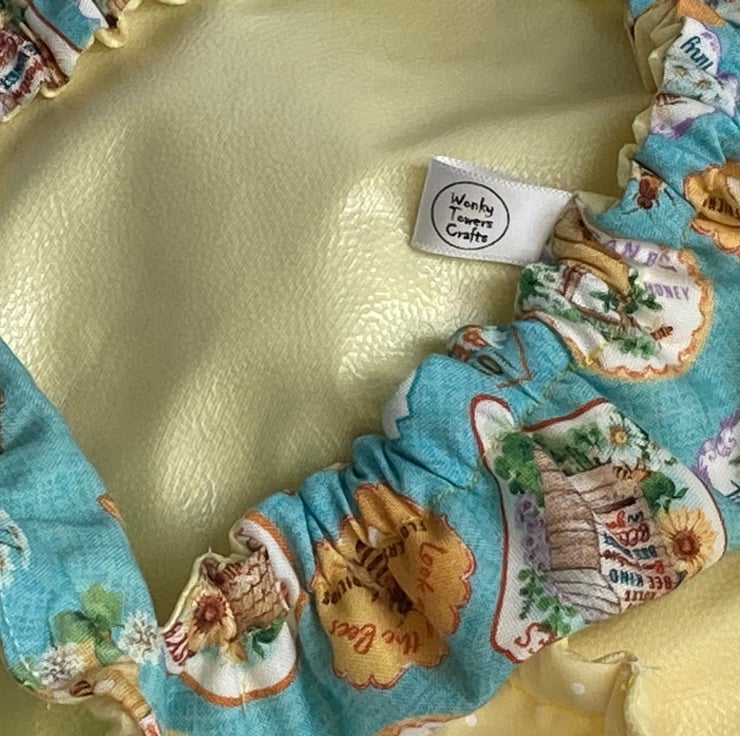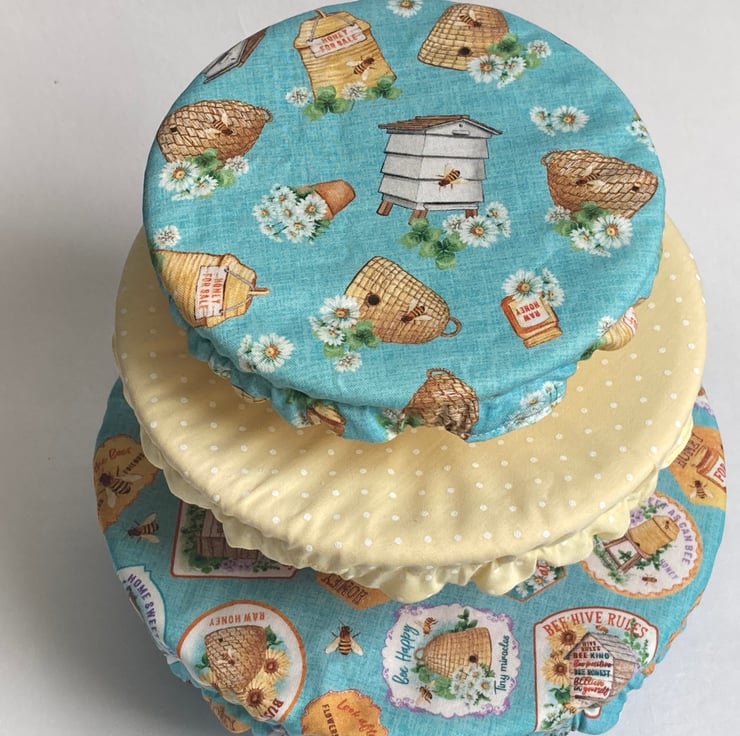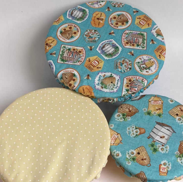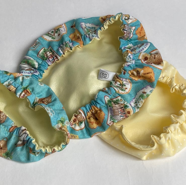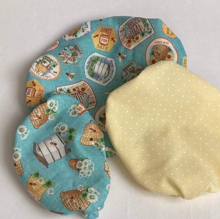 This set of 3 covers will fit bowls approximately 23cm, 19cm and 16cm (9", 7.5" and 6"). They are made from 3 pretty cotton fabrics in shades of light turquoise and yellow and decorated with beehives and bees. The PUL lining is pale yellow.