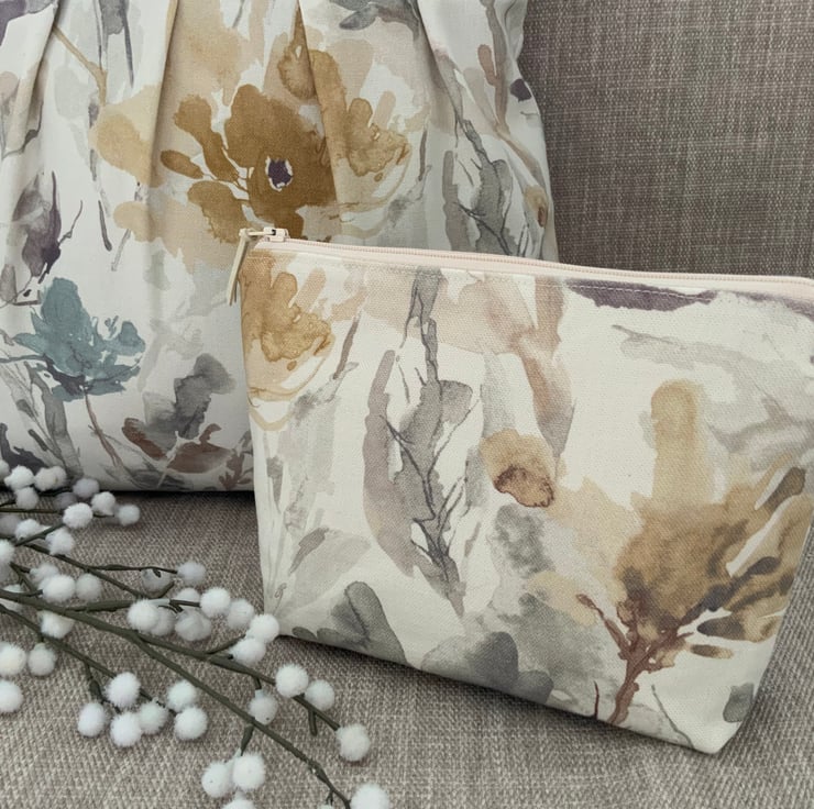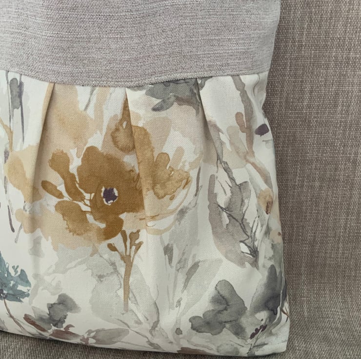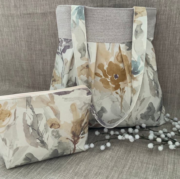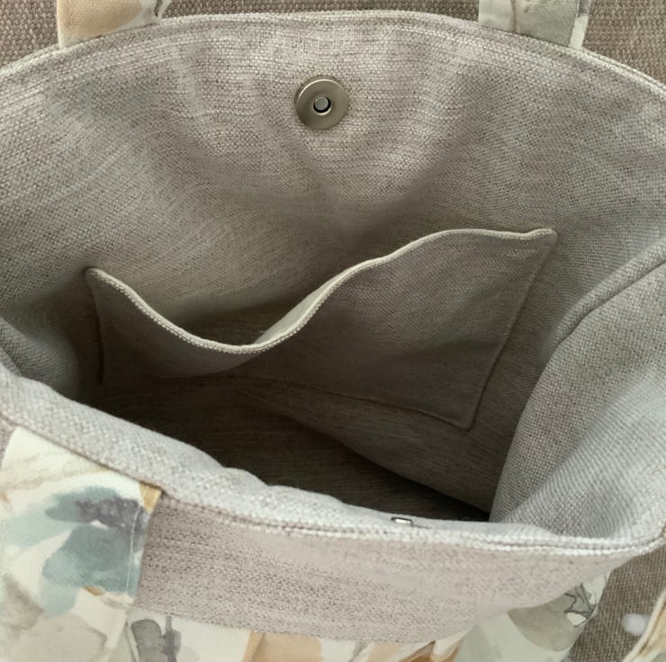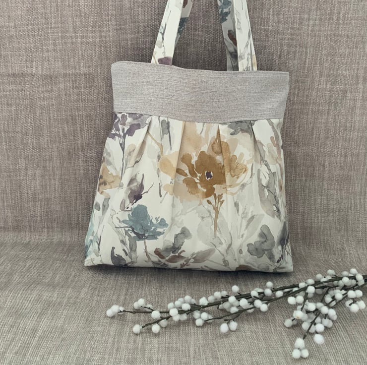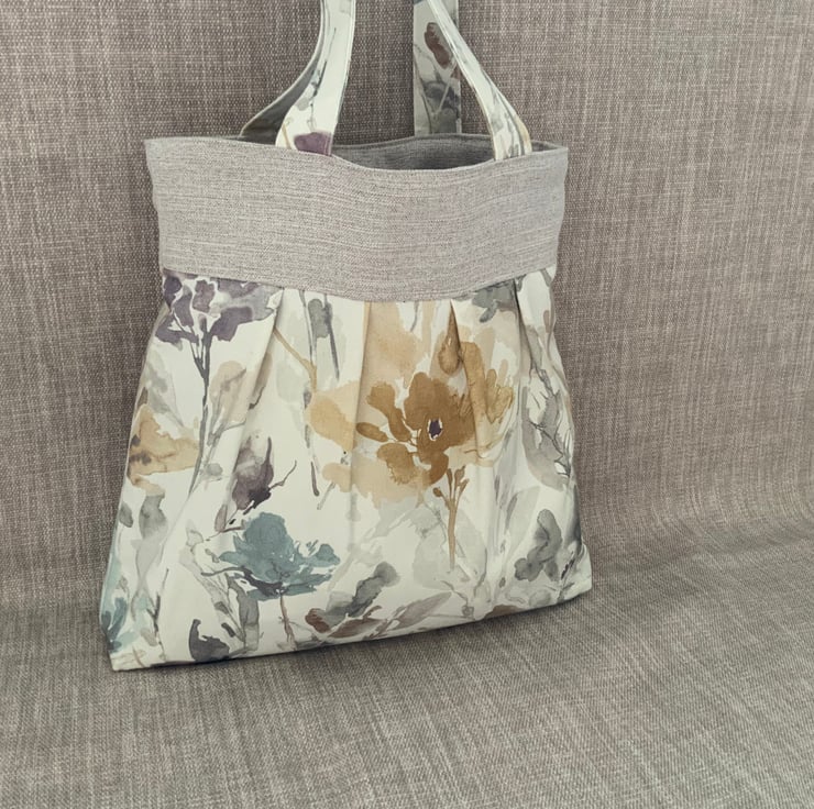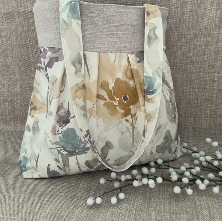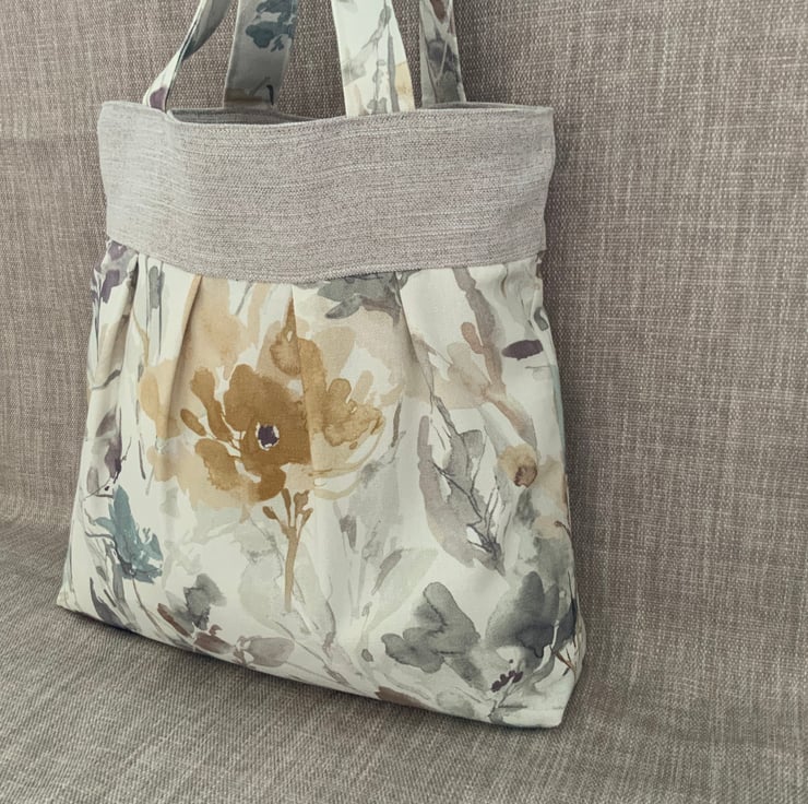 Beautiful pleated tote bag. Natural coloured band at top with a pleated floral fabric beneath. Lined with quality upholstery fabric with a layer of interlining sandwiched in between to give it a little structure. Internally, it has a small slip pocket and is fitted with a magnetic snap fastener. The square bottom gives the bag extra depth.