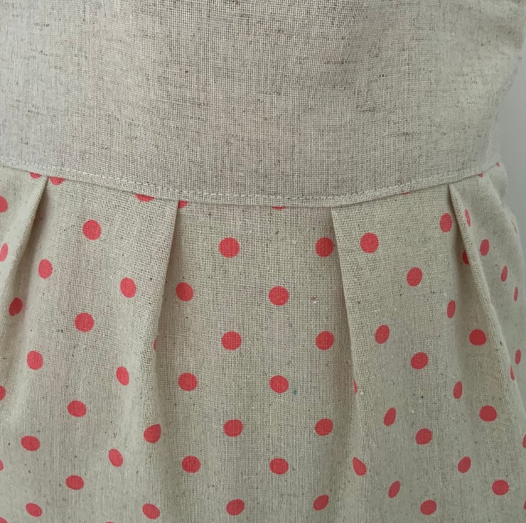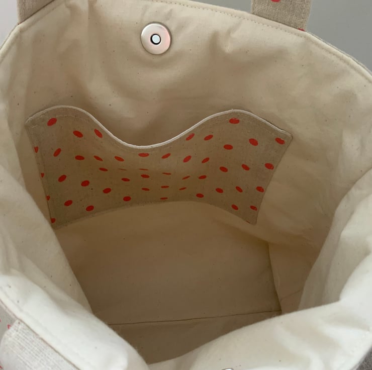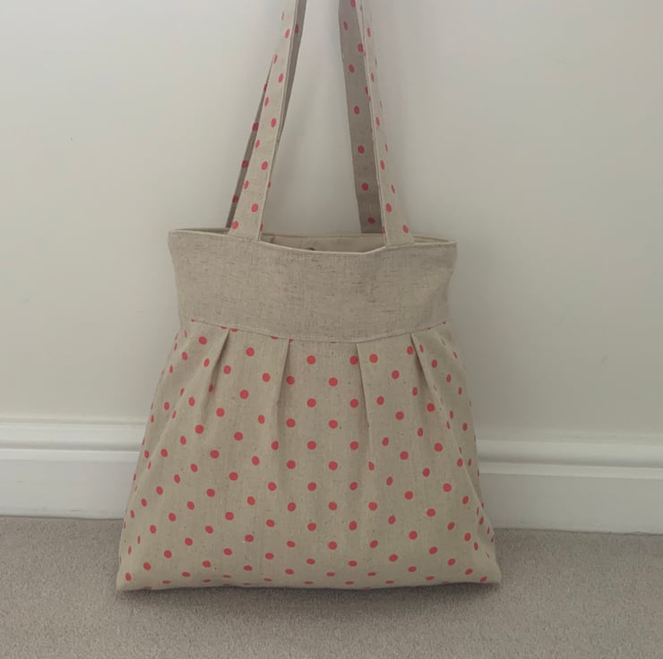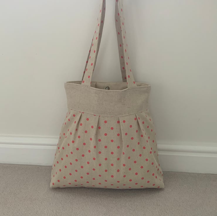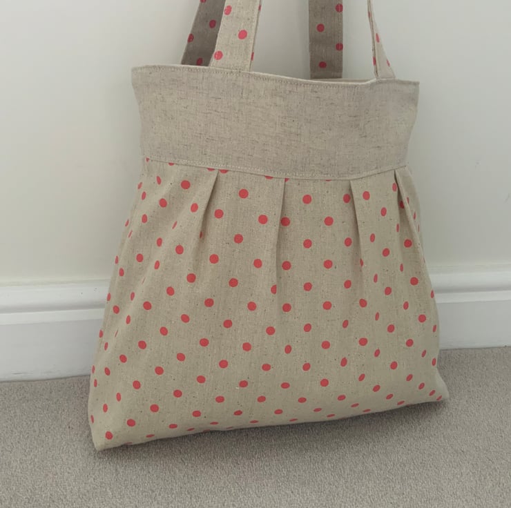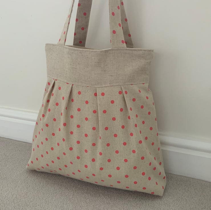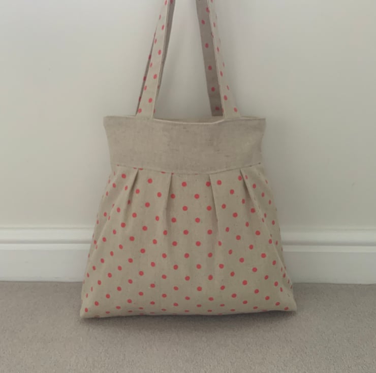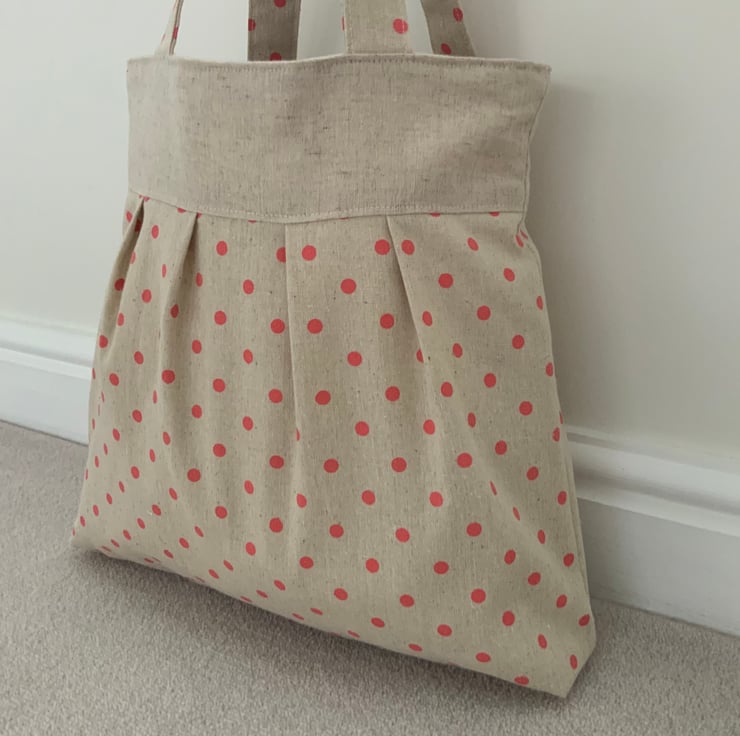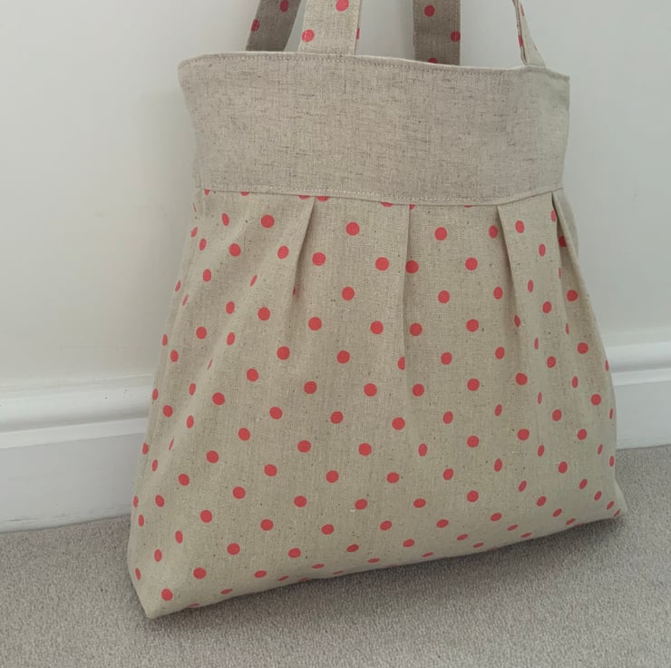 Beautiful handmade pleated tote bag. Natural coloured band at top with a pleated spotty linen / canvas type fabric beneath. Please note: the spotty fabric does show some ‘slubbing’ (minor bobbling - this is a characteristic of this type of fabric). Lined with natural calico fabric with a layer of interlining sandwiched in between to give it a little structure. Internally, it has a small slip pocket and is fitted with a magnetic snap fastener. The square bottom gives the bag extra depth.