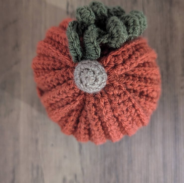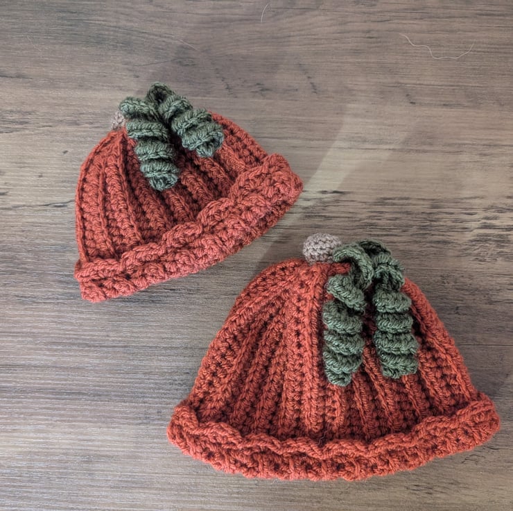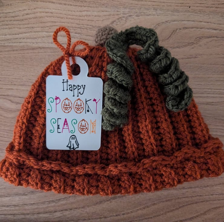 Keep your little one cosy and cute this fall with this handmade crochet pumpkin hat. Featuring a charming stalk, two vines, and a scalloped edging, this hat is the perfect autumn accessory.