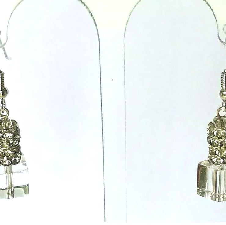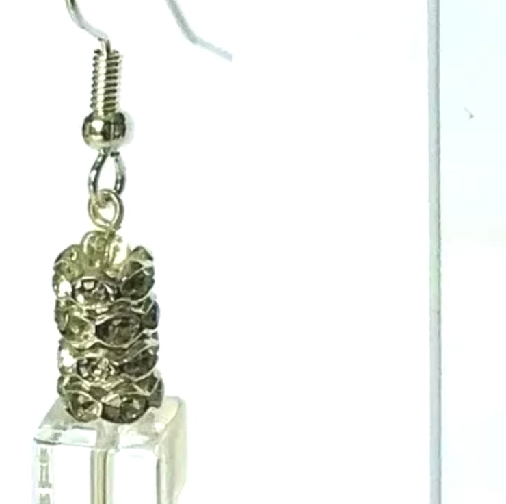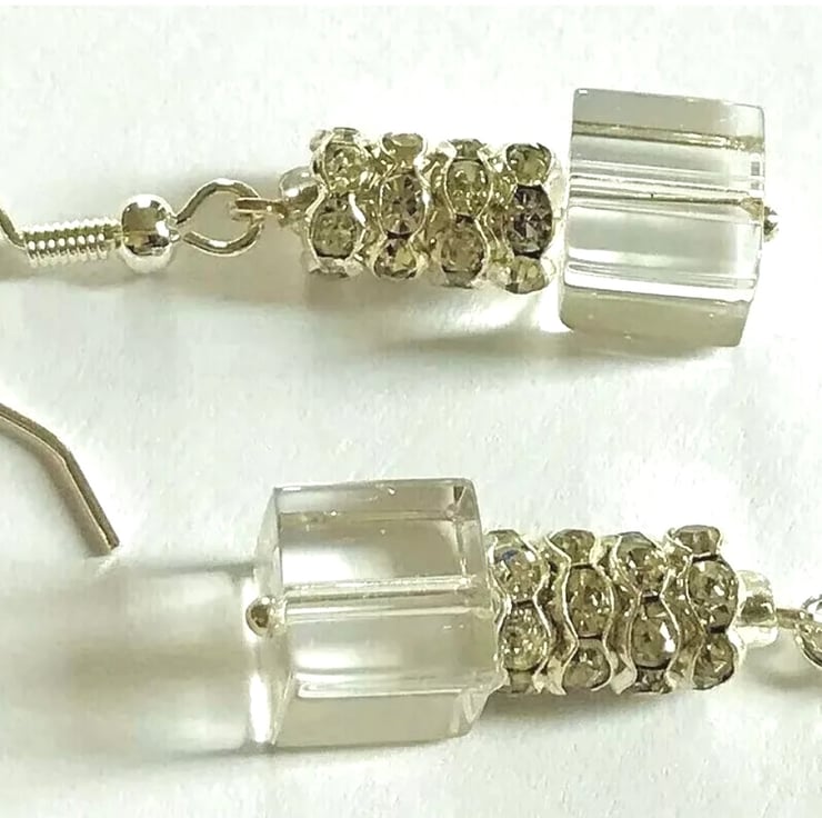 Clear coloured Cube Shaped Glass Beaded Earrings with Diamante Rondelles (Wheel shaped Beads)